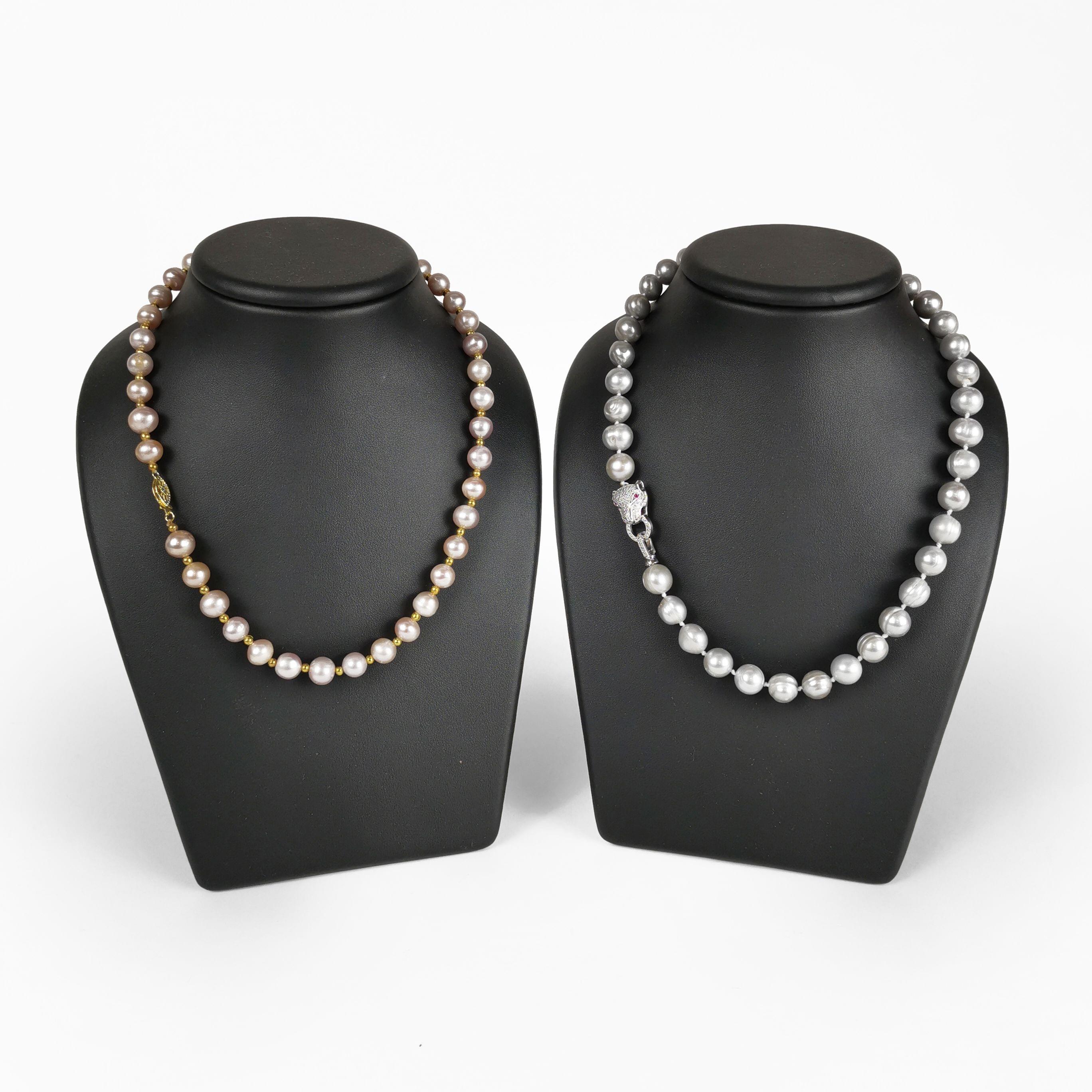 L'un composé de perles grises terminé par un fermoir à motif de tête de panthère pavée de pierres d'imitation pour le diamant et l'autre composé de perles roses alternées de perles dorées, fermoir en or 585 et en métal, L 47 et 49 cm