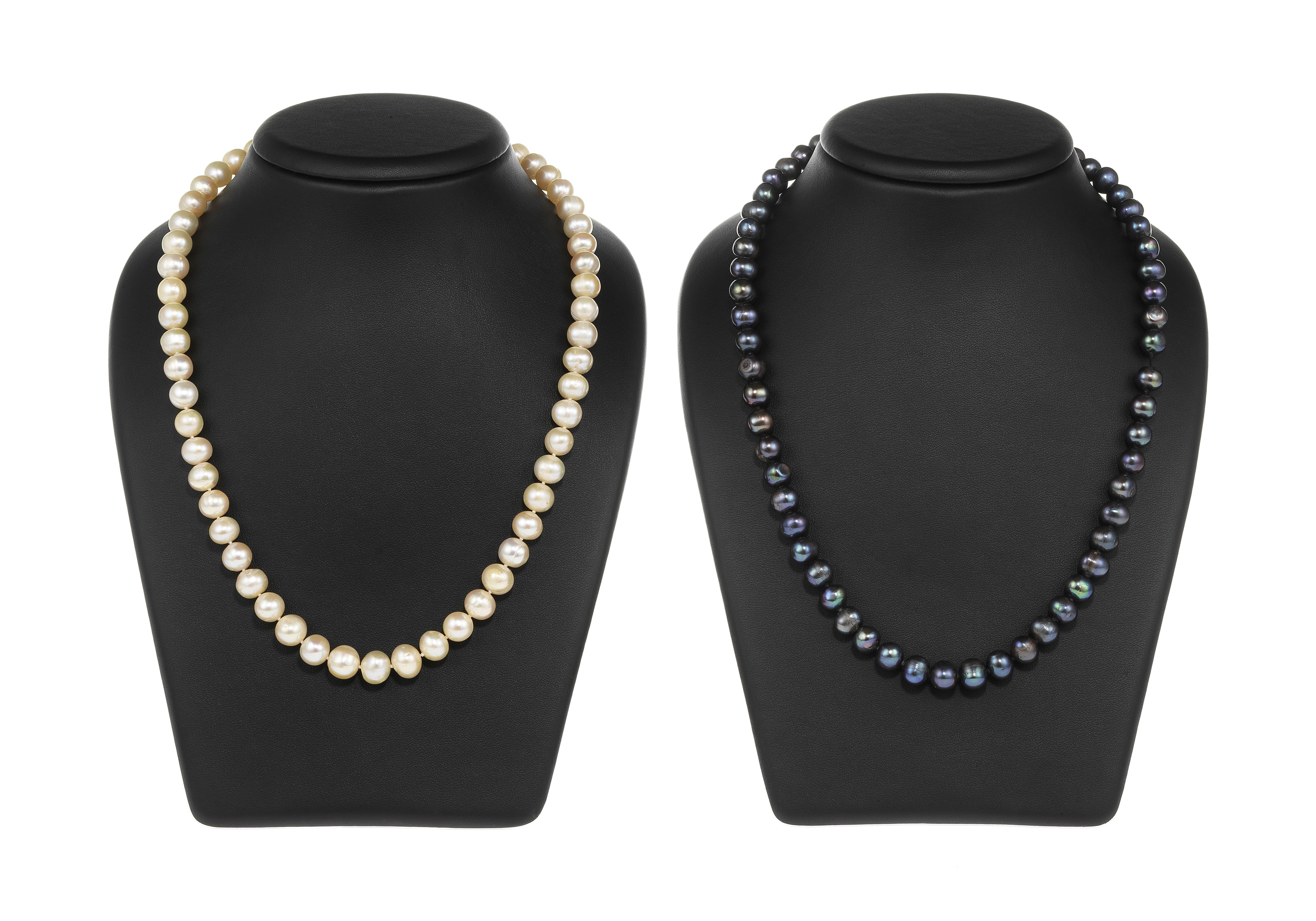 L'un composé de perles violines (D env. 9 mm) et l'autre composé de perles blanches légèrement rosées, fermoirs à motif floral en argent 925, L 52 et 53 cm