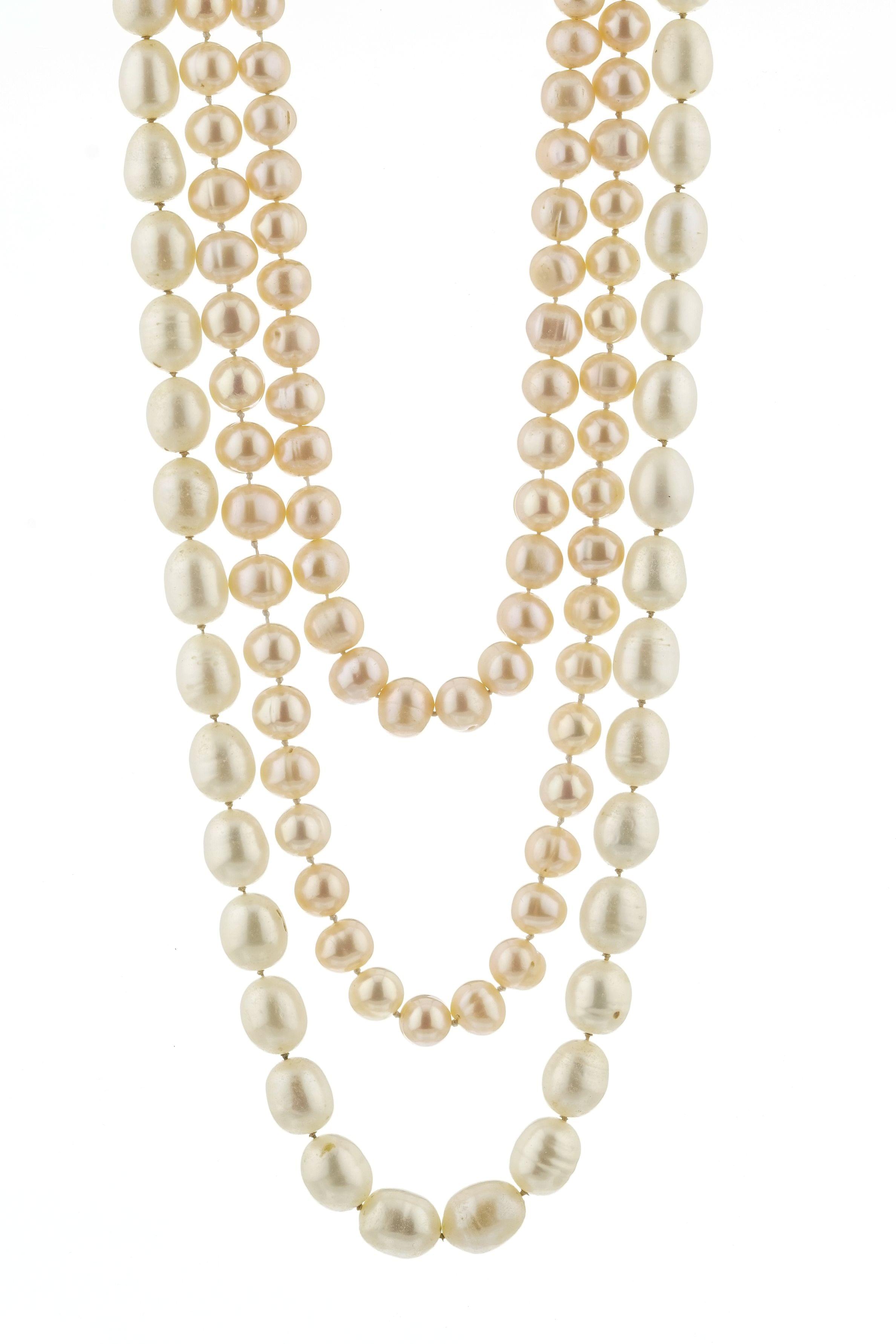3123. Lot de deux colliers de perles d'eau douce blanches et roses