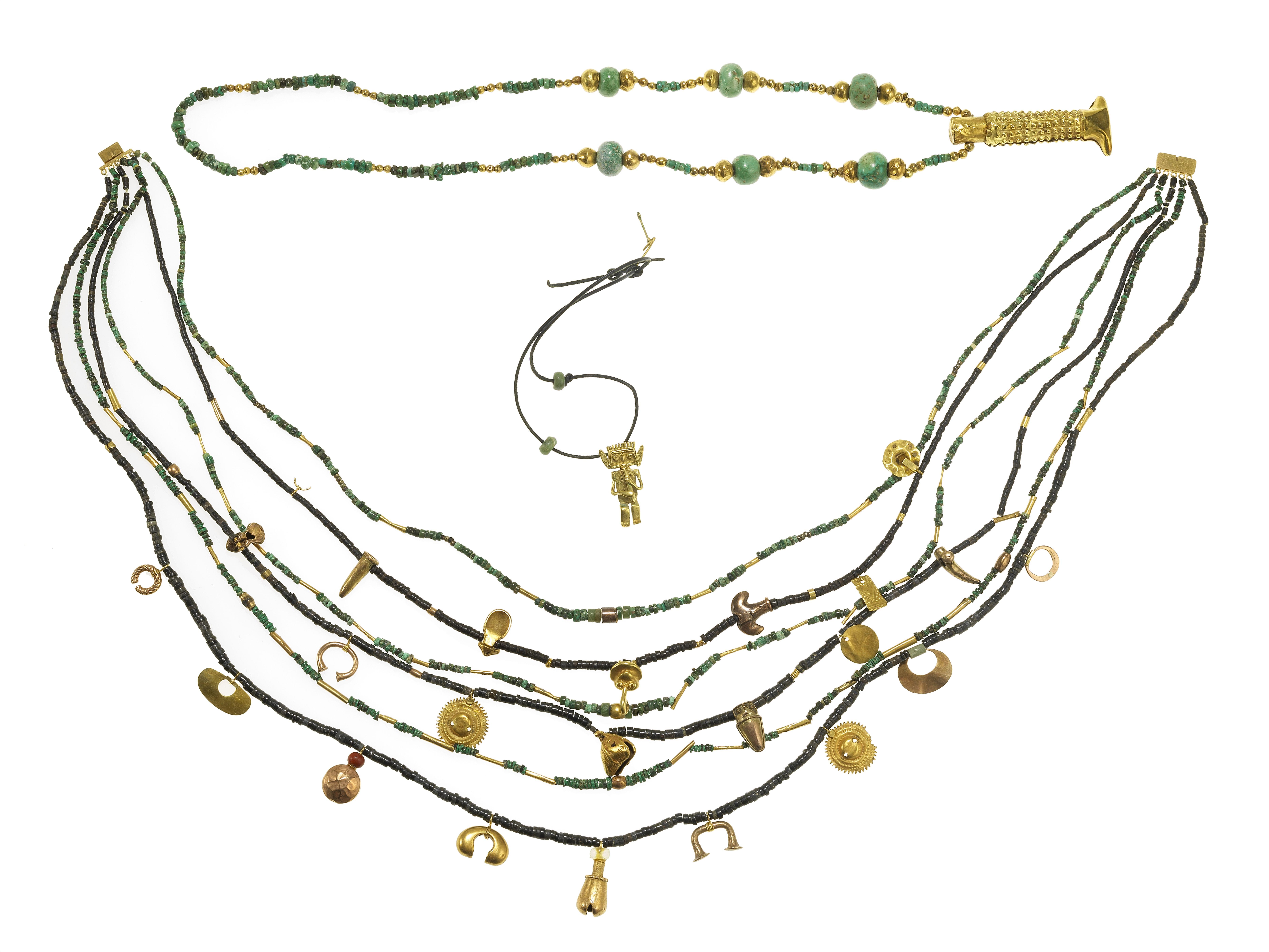 L'un multi-rangs composé de perles de turquoises, de perles noires et de motifs en or, le second composé de perles de turquoises et or retenant un motif en or, or 750, 585, et bas titre L env . 75 cm. On joint un pendentif sur cordon à motif de personnage joueur de flute en métal doré, H 3,5 cm. Provenance : collection Marisa Perret-Rezzonico