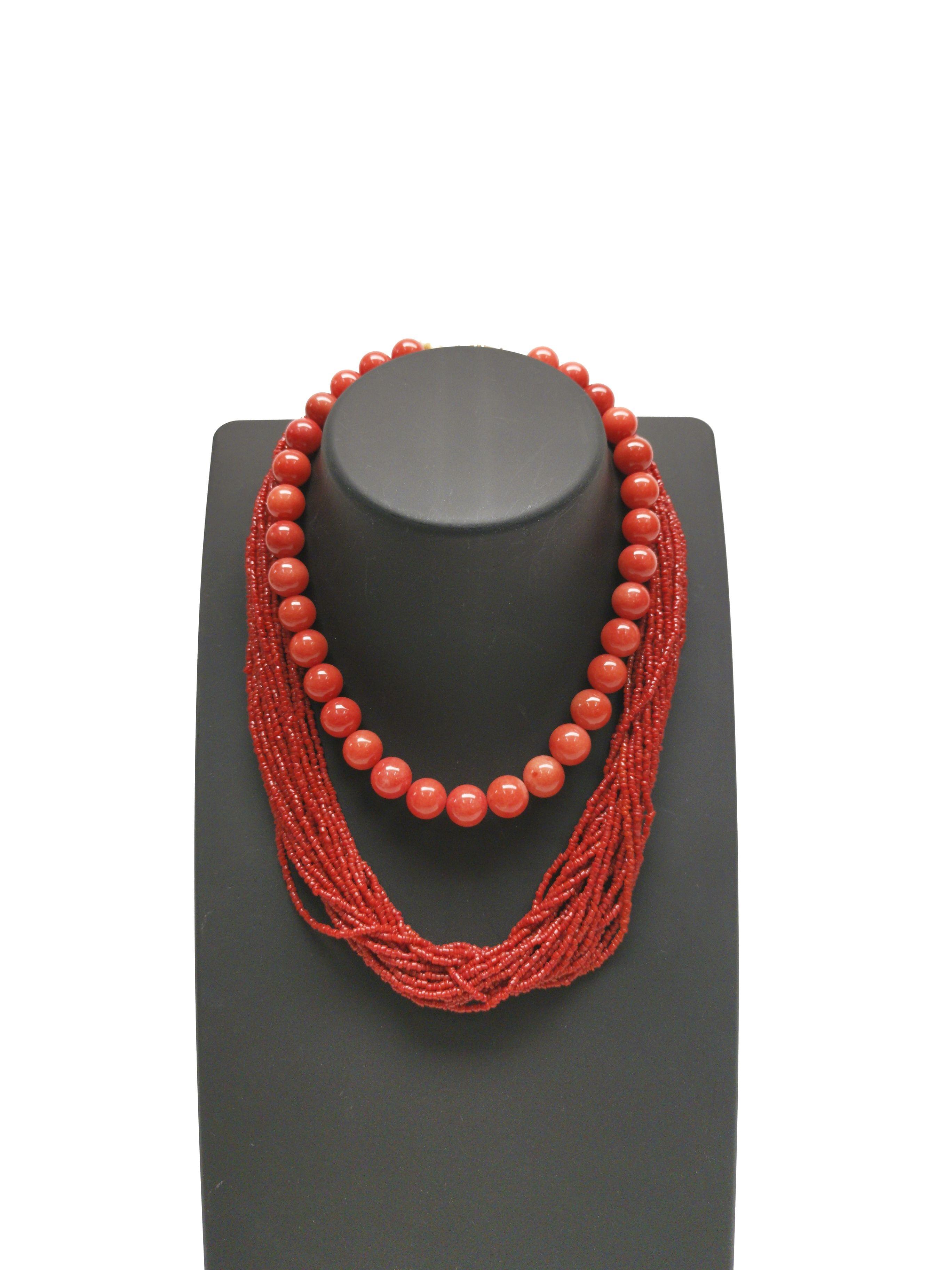 3245. Lot de deux colliers, l'un à multi-rangs de perles de corail et l'autre composé de pierres dures couleur corail