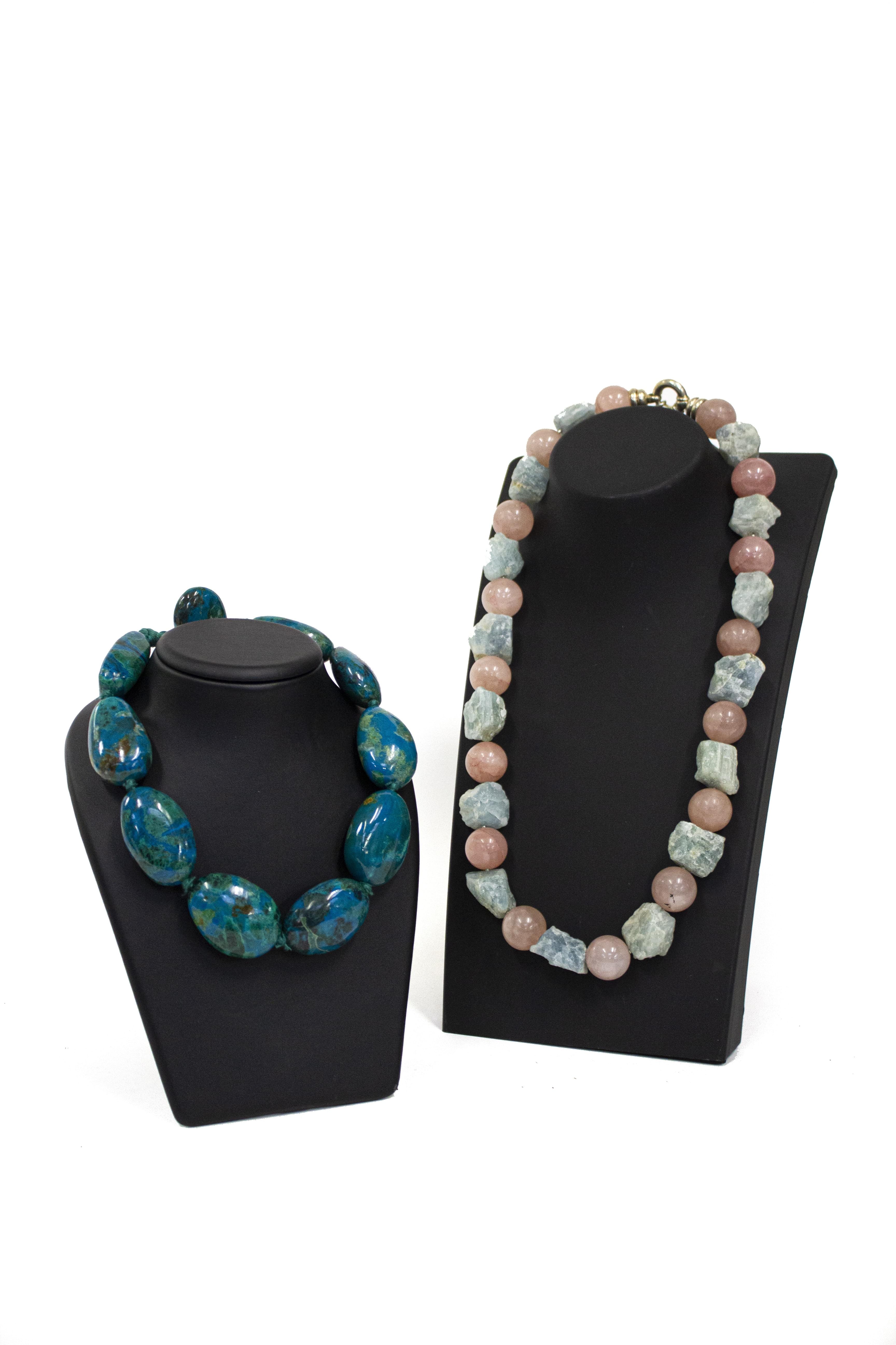 3135. Lot de deux colliers, l'un de perles de quartz rose alternées d'aigue-marine brute et l'autre de perles de chrysocolle
