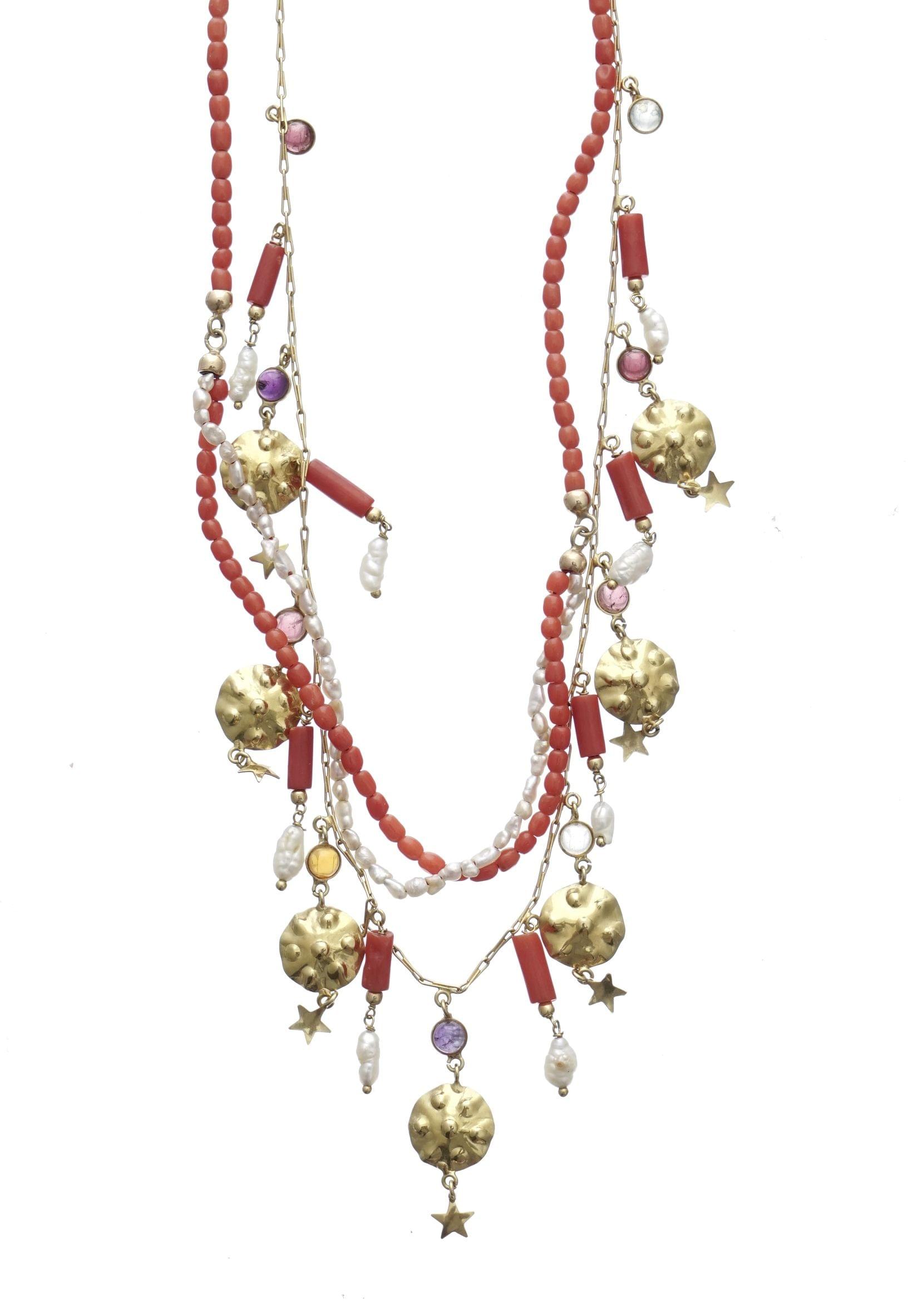 3251. Lot de deux colliers, l'un serti de perles de corail et d'une ligne de perles de nacre, l'autre à maille fantaisie retenant des bâtonnets de corail et de nacre et ponctué de pierres semi-précieuses en cabochon