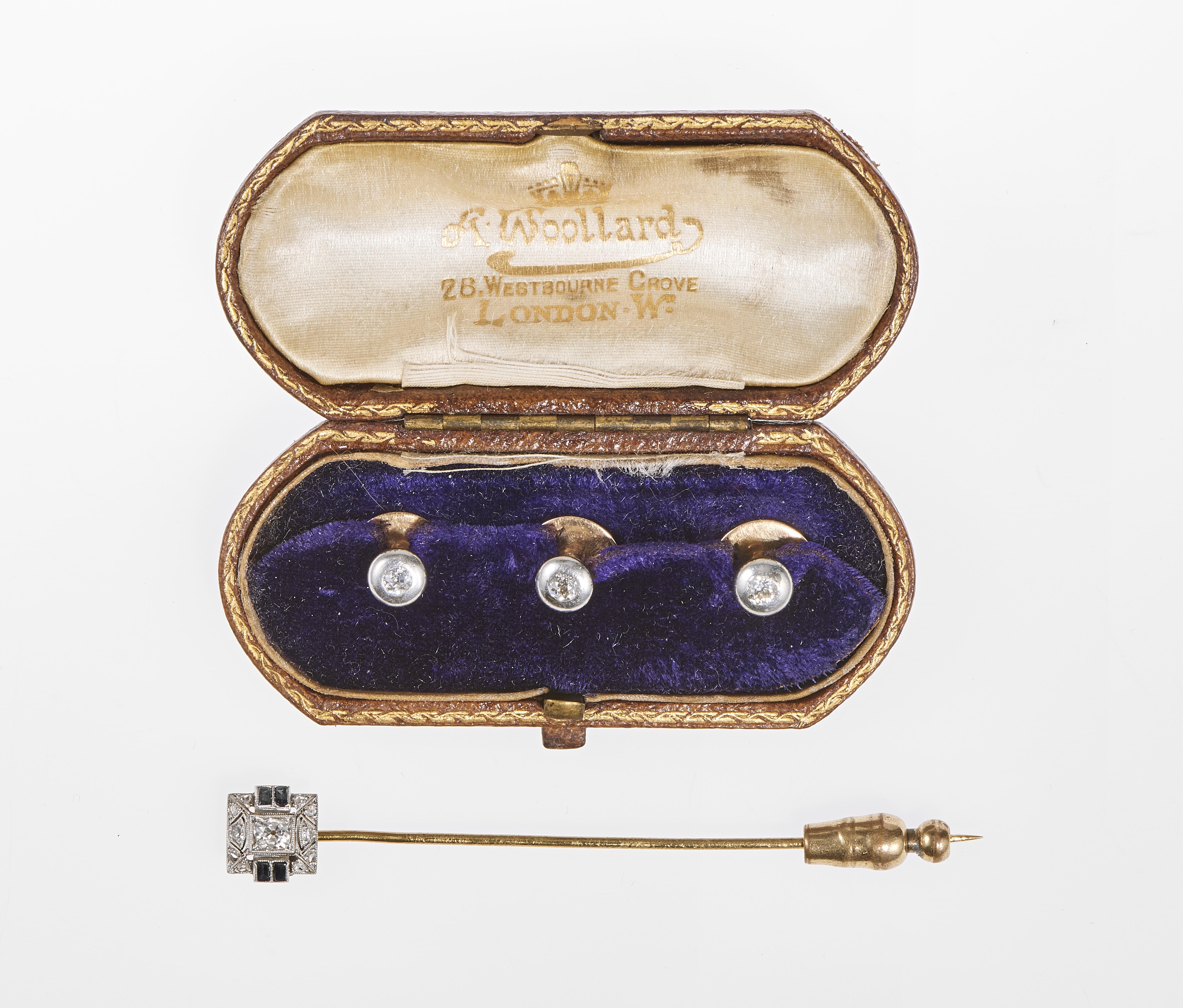 Or, or gris 750 et argent, H 7,5 cm. On joint un ensemble de trois boutons de plastron sertis chacun d'un diamant taille ancienne en or et or gris 585, 3 g, dans leur écrin.
