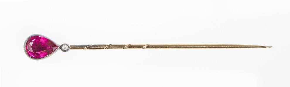 3214. Lot de deux épingles à cravate, l'une terminée par un motif serti d'un diamant taille ancienne entouré de diamants et de saphirs calibrés, et l'autre sertie d'un rubis probablement synthétique taille poire rehaussé d'un diamant