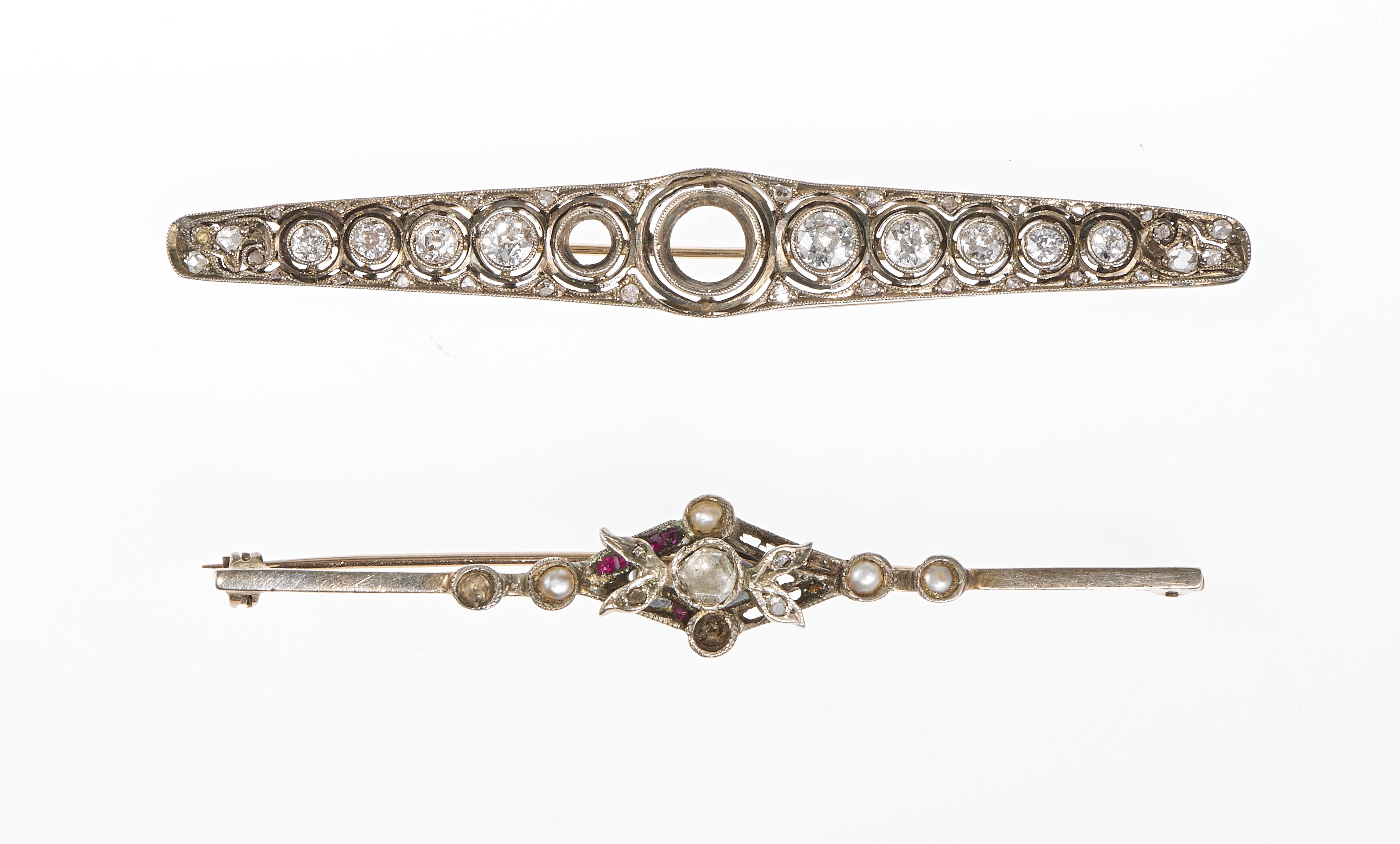 3207. Lot de deux épingles barrettes, l'une sertie de diamants taille ancienne (env. 1 ct) et l'autre d'une rose de diamant et de demi-perles