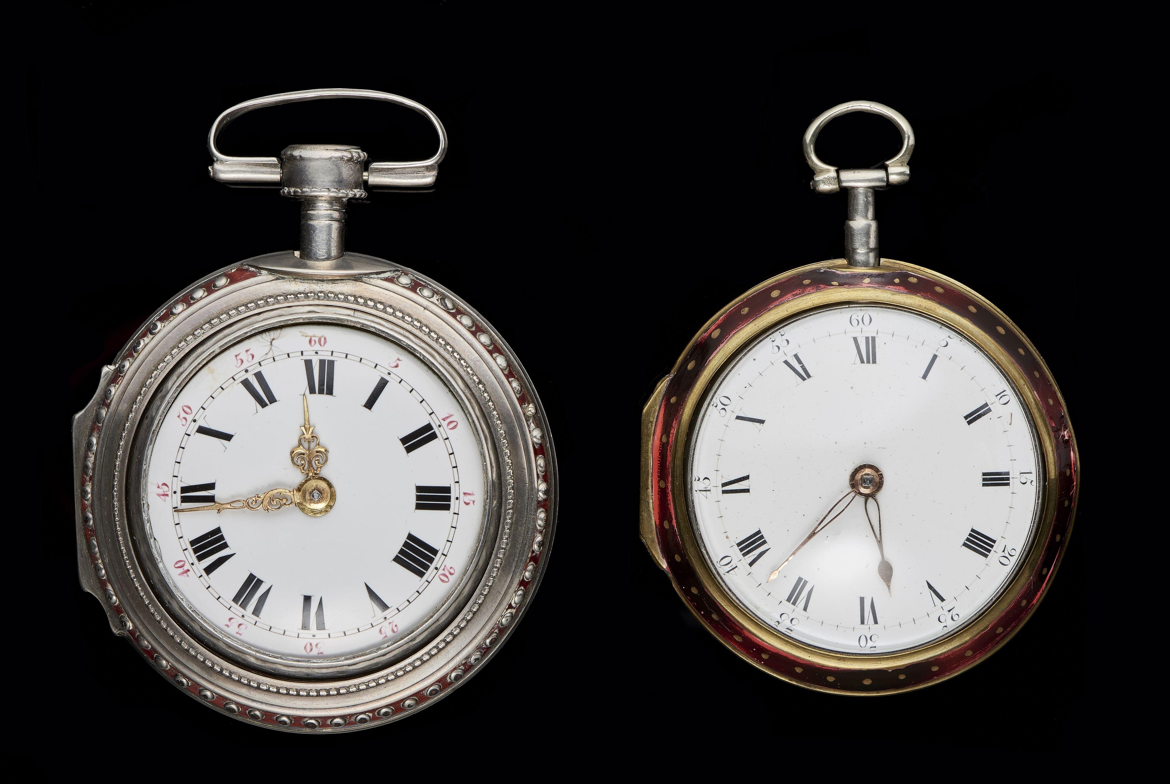 Cadrans émaillés blancs, aiguilles dorées, chiffres romains noirs, milieu XVIIIe s, argent, D env. 65 et 60 mm