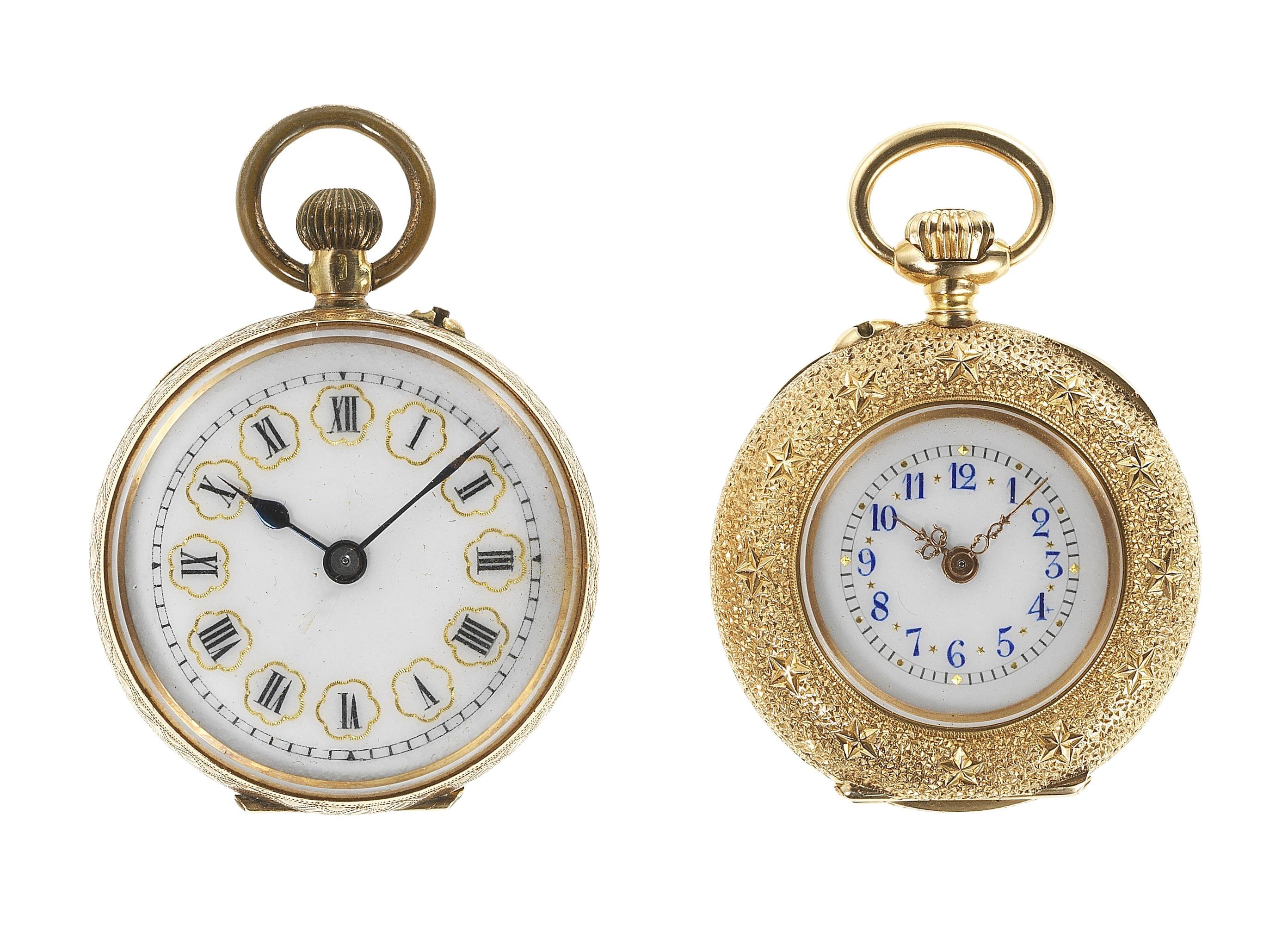 Cadrans blancs émaillés, aiguilles dorées et bleuies, chiffres arabes bleus et chiffres romains noirs, circa 1890, l'une en or 750 dans son écrin et l'autre en or 585 avec cuvette et bélière en métal, D 27 mm, poids brut 35 g