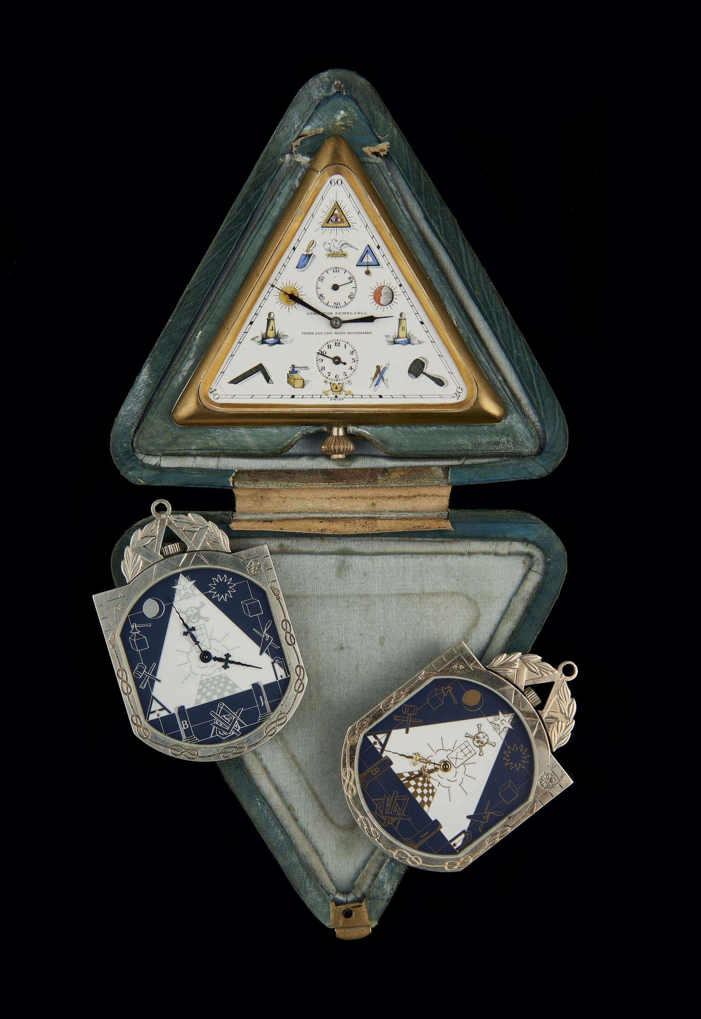 Cadran à motif d'un triangle blanc sur fond bleu, aiguilles dorées et bleues, argent 925, 52x45 mm, dans leur écrin. On joint une pendulette triangulaire décorée de symboles maçonniques et de la devise "Aime ton prochain, tend-lui une main secourable", cadran émaillé blanc, aiguilles violettes, secondes au centre, métal doré, 70x82 mm, dans son écrin