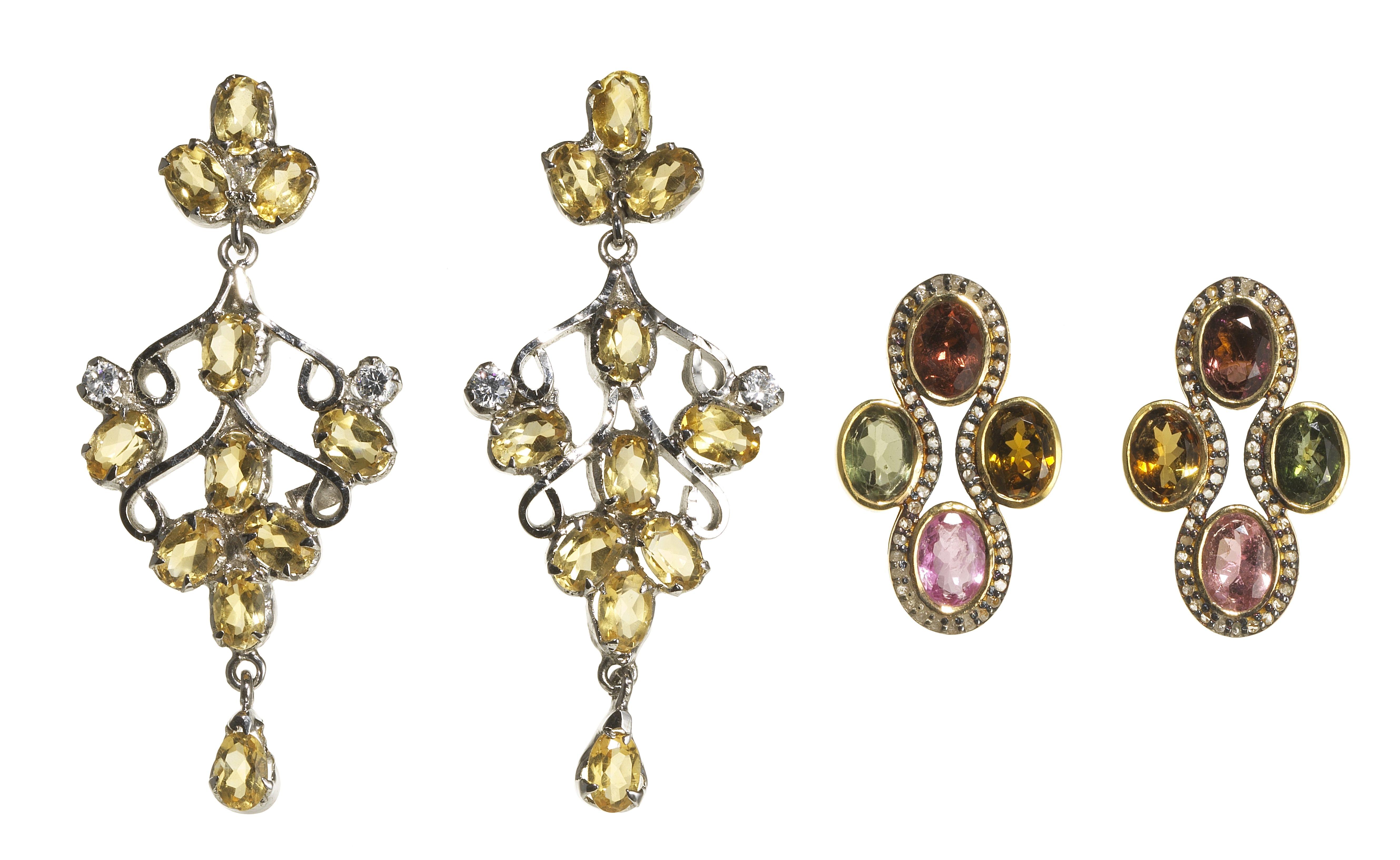 L'une ajourée sertie de citrines taille ovale rehaussées de topazes blanches et l'autre sertie de tourmalines taille ovale entourées de roses de diamant, argent et vermeil 925, H 5 et 2,5 cm. Pour les lots précédés d'un *, la TVA de 7,7% est due sur l'entier du prix d'adjudication.