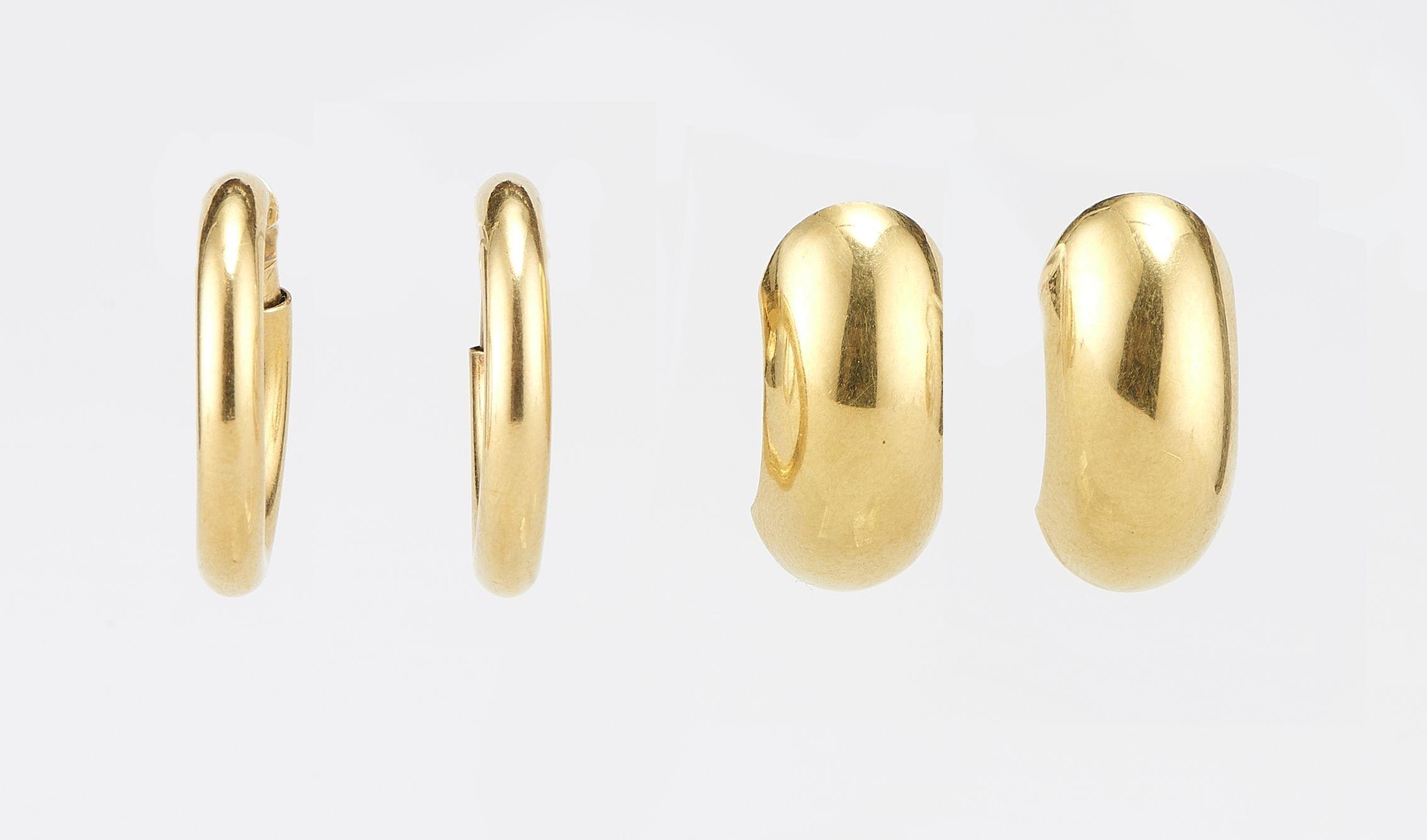 Or et or gris 750, H 6,5 et 7 cm, poids brut 6 g. Provenance: co...