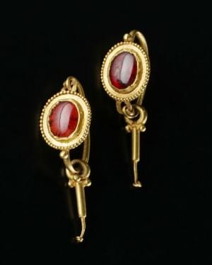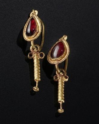 998. Lot de deux paires de pendants d'oreilles de style proche ou moyen-oriental, l'une sertie de grenats ovales entourés de perlettes et l'autre sertie de grenats piriformes dans un disque entouré de perlettes