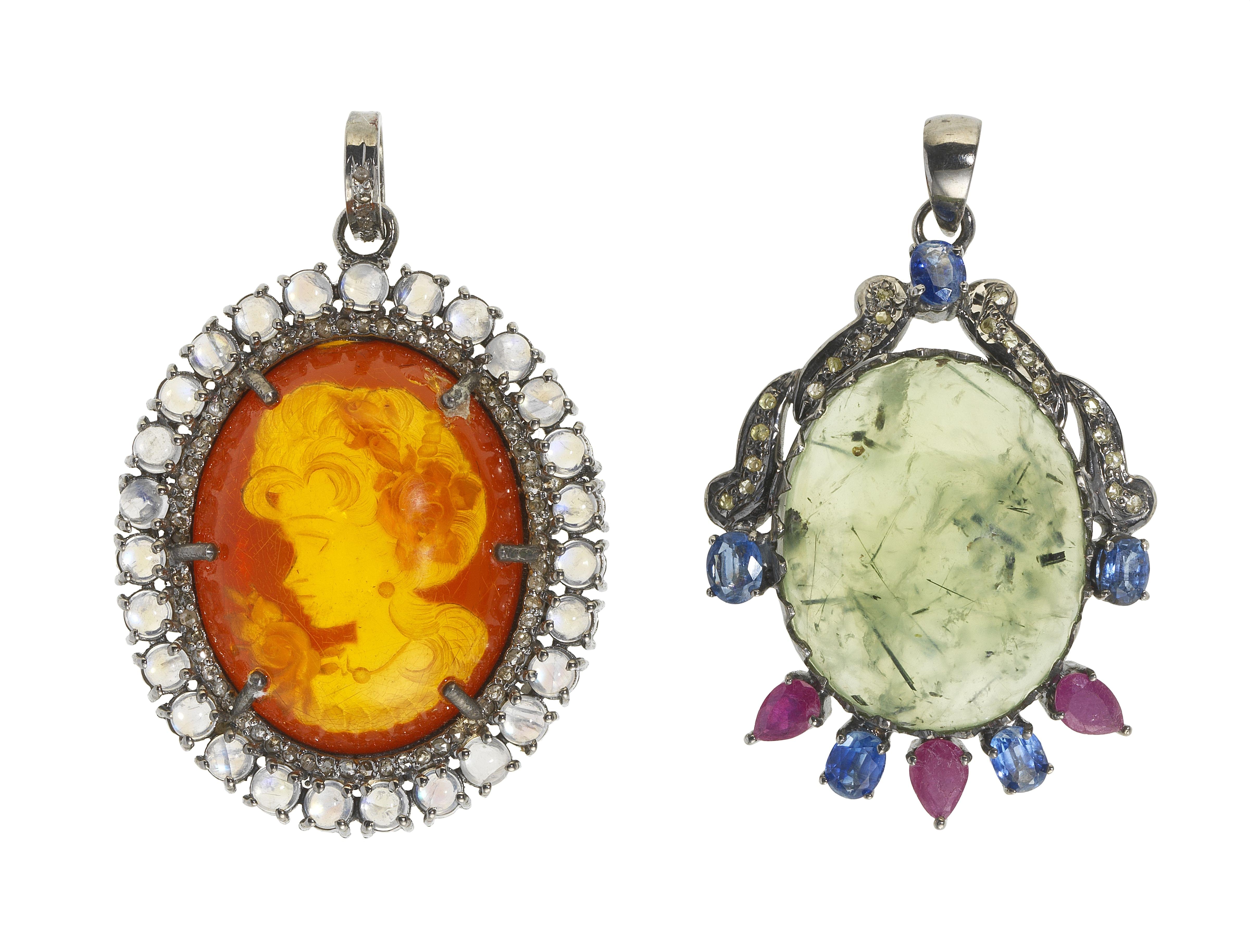 L'un serti d'une agate taille cabochon ovale entourée de rubis, de saphirs et de roses de diamant et l'autre centré d'une ambre sculptée d'un portrait de jeune femme entourée de pierres de Lune et de roses de diamant, argent 925, H 5 et 5,5 cm. Pour les lots précédés d'un *, la TVA de 7,7% est due sur l'entier du prix d'adjudication.