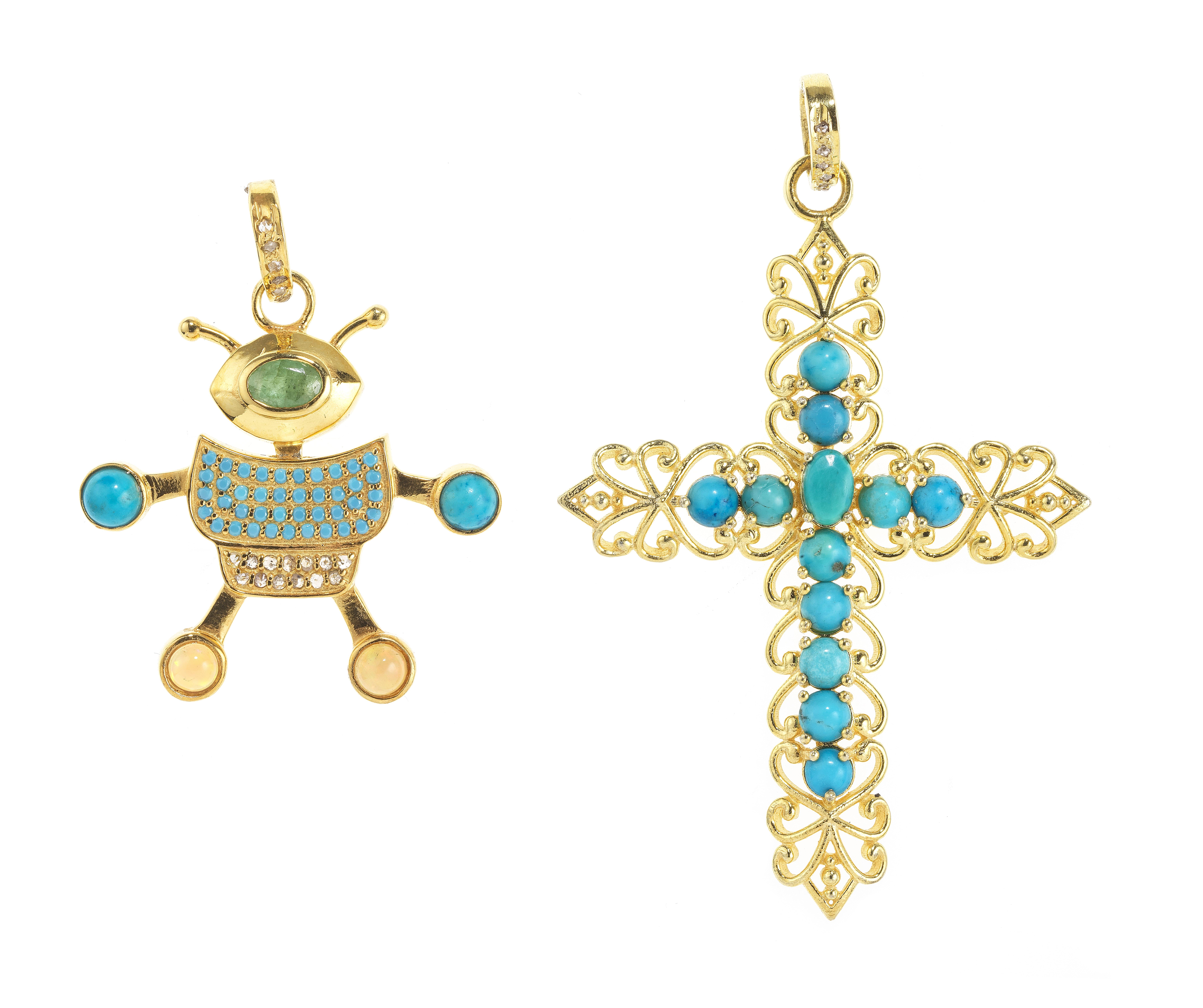 L'un à motif de croix ajourée sertie de turquoises et l'autre à motif de robot pavé de turquoises, opales, roses de diamants et d'une émeraude, vermeil 925, H 4 et 7 cm. Pour les lots précédés d'un *, la TVA de 7,7% est due sur l'entier du prix d'adjudication.
