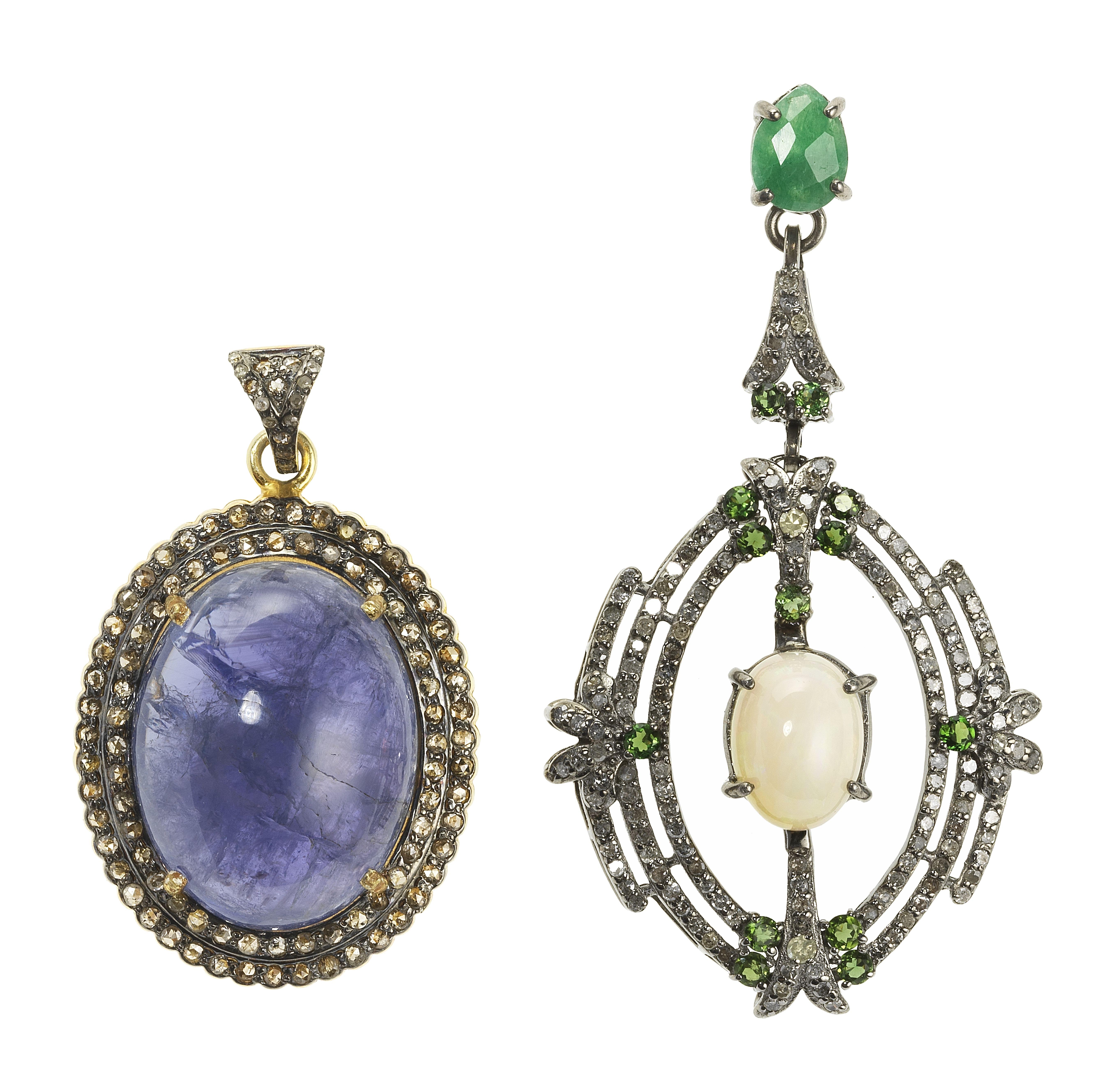 Le premier centré d'une opale taille cabochon ovale (env. 3 ct) sur une monture ajourée pavée de roses de diamants, de tsavorites et d'une émeraude taille poire facettée, le second centré d'une tanzanite taille cabochon ovale dans un double entourage de roses de diamant, argent noirci et vermeil 925, H 7 et 4,5 cm. Pour les lots précédés d'un *, la TVA de 7,7% est due sur l'entier du prix d'adjudication.