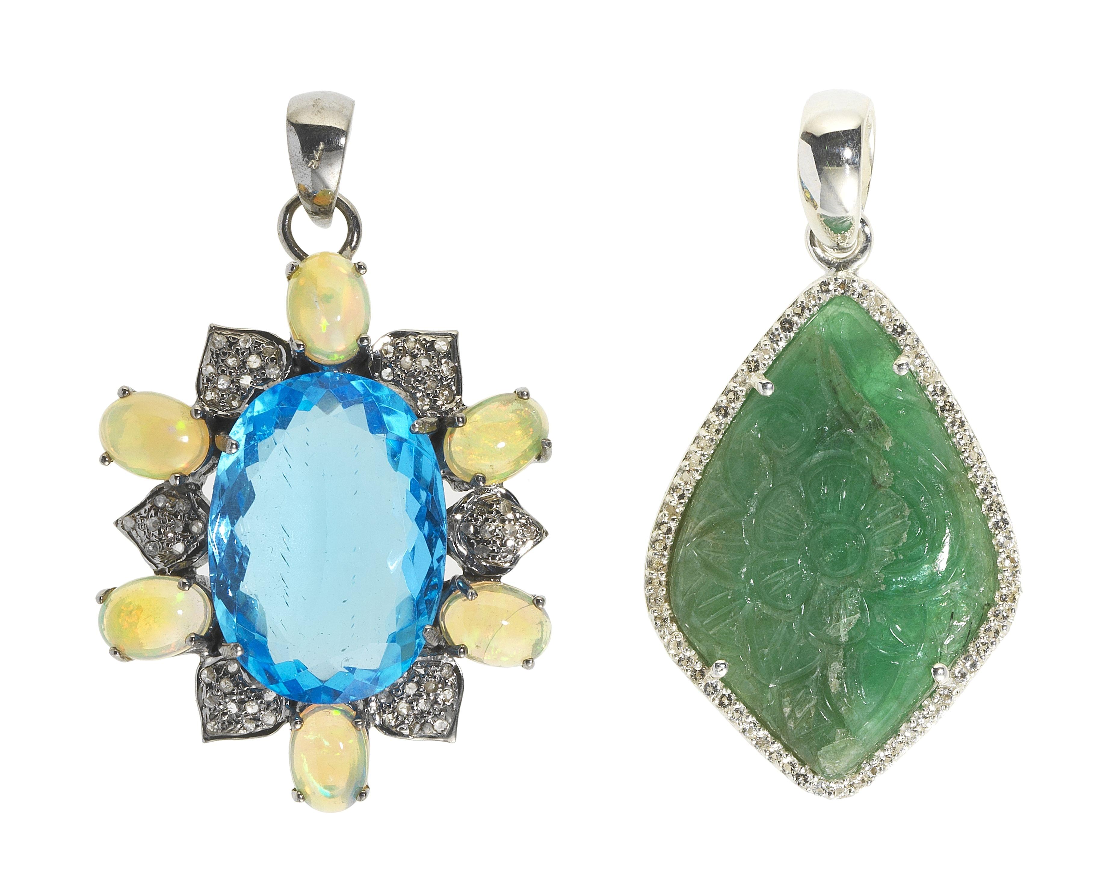 L'un serti d'une émeraude sculptée à motif floral (env. 17 ct) entourée de topazes blanches et l'autre serti d'une topaze bleue taille ovale entourée d'opales taille cabochon ovale et de motifs de cœurs pavés de roses de diamant, argent 925, H 4,5 cm. Pour les lots précédés d'un *, la TVA de 7,7% est due sur l'entier du prix d'adjudication.