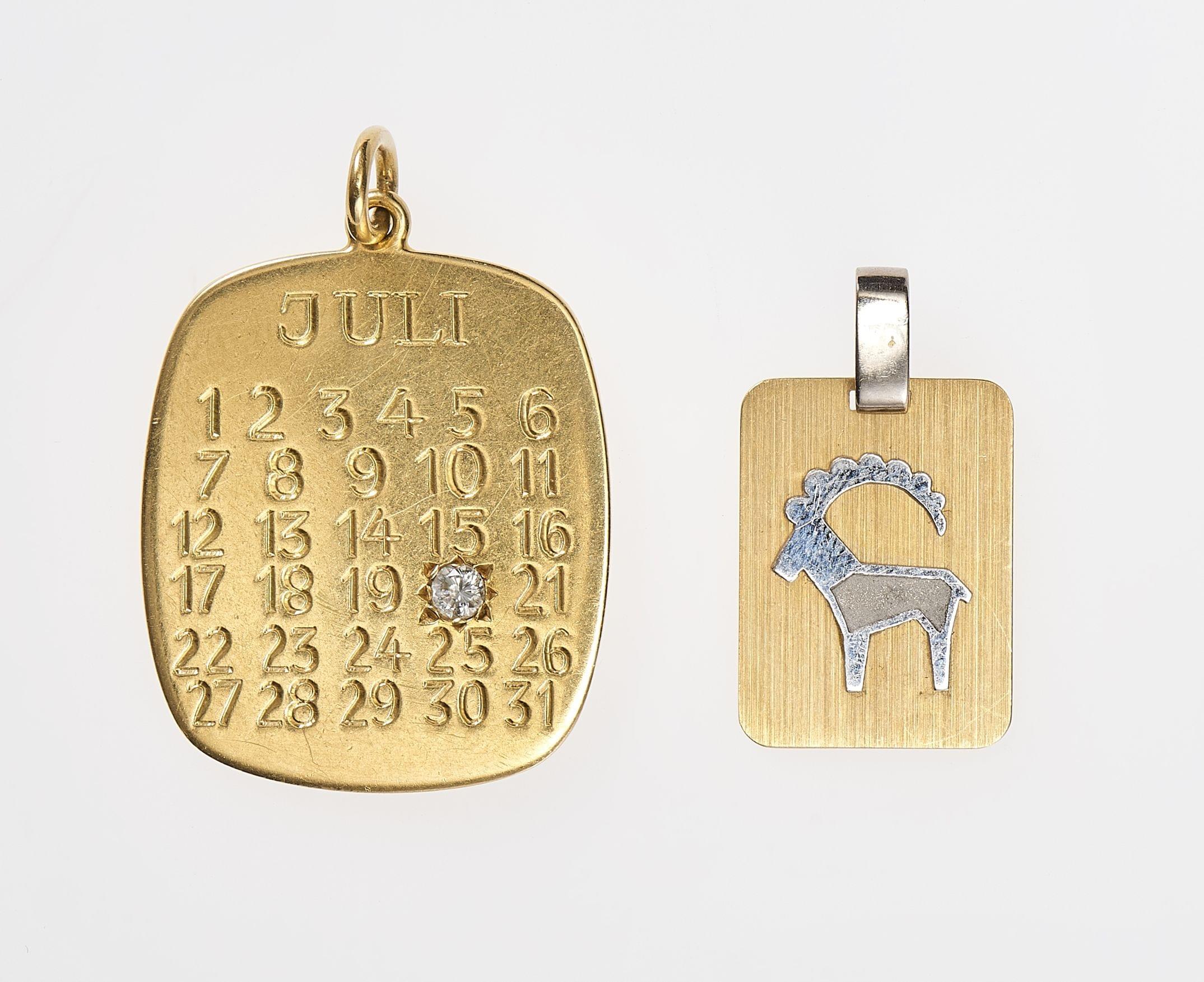 3438. Lot de deux pendentifs, l'un du mois de Juillet serti d'un diamant au 20 et l'autre du signe du capricorne