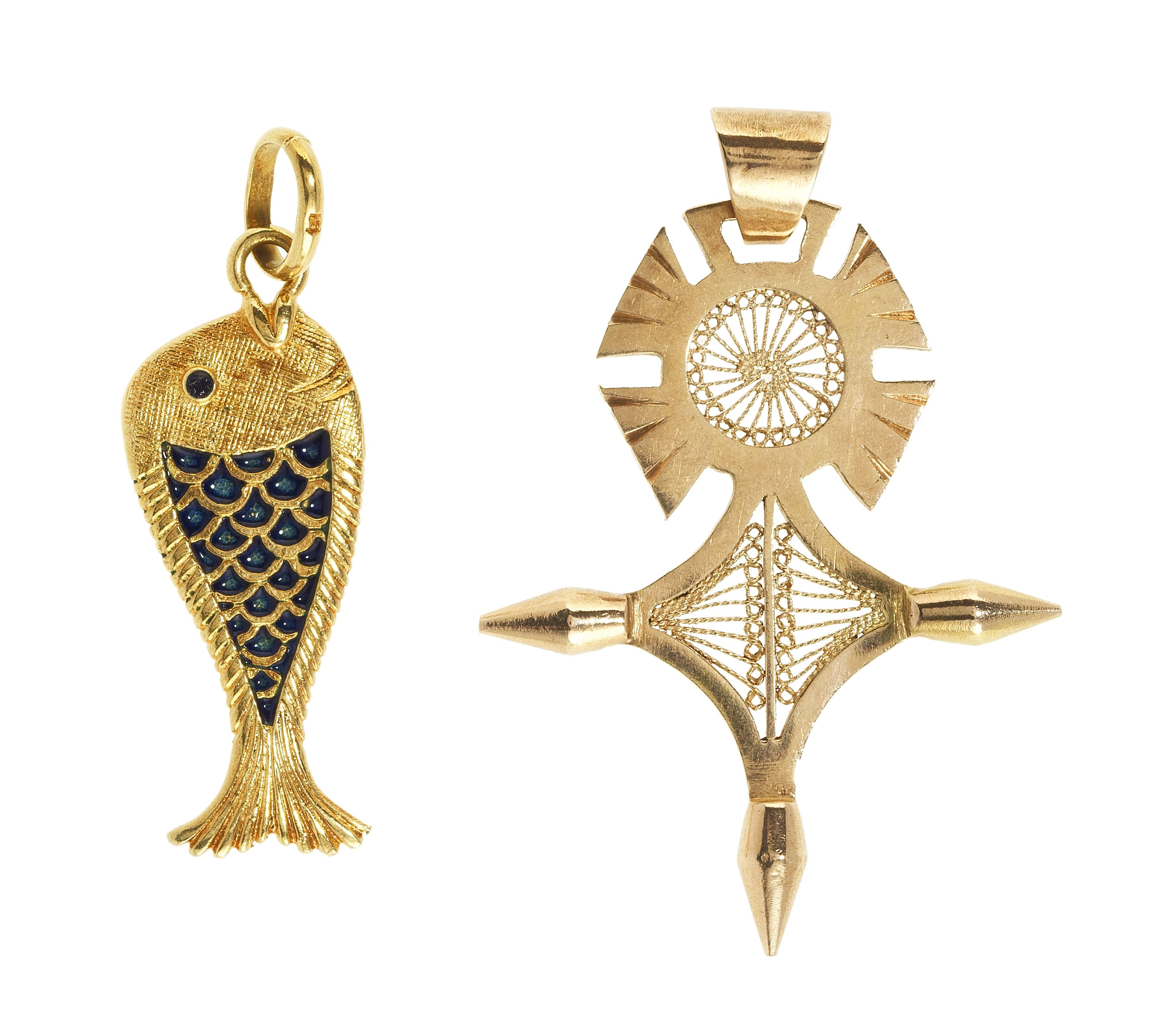 3335. Lot de deux pendentifs, une croix d'Agadèz et un poisson émaillé