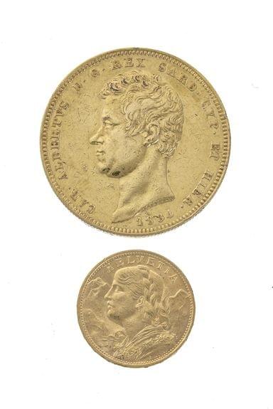 83. Lot de deux pièces, l'une de 100 lires italiennes datée de 1834 et l'une de 20 francs suisses datée de 1922