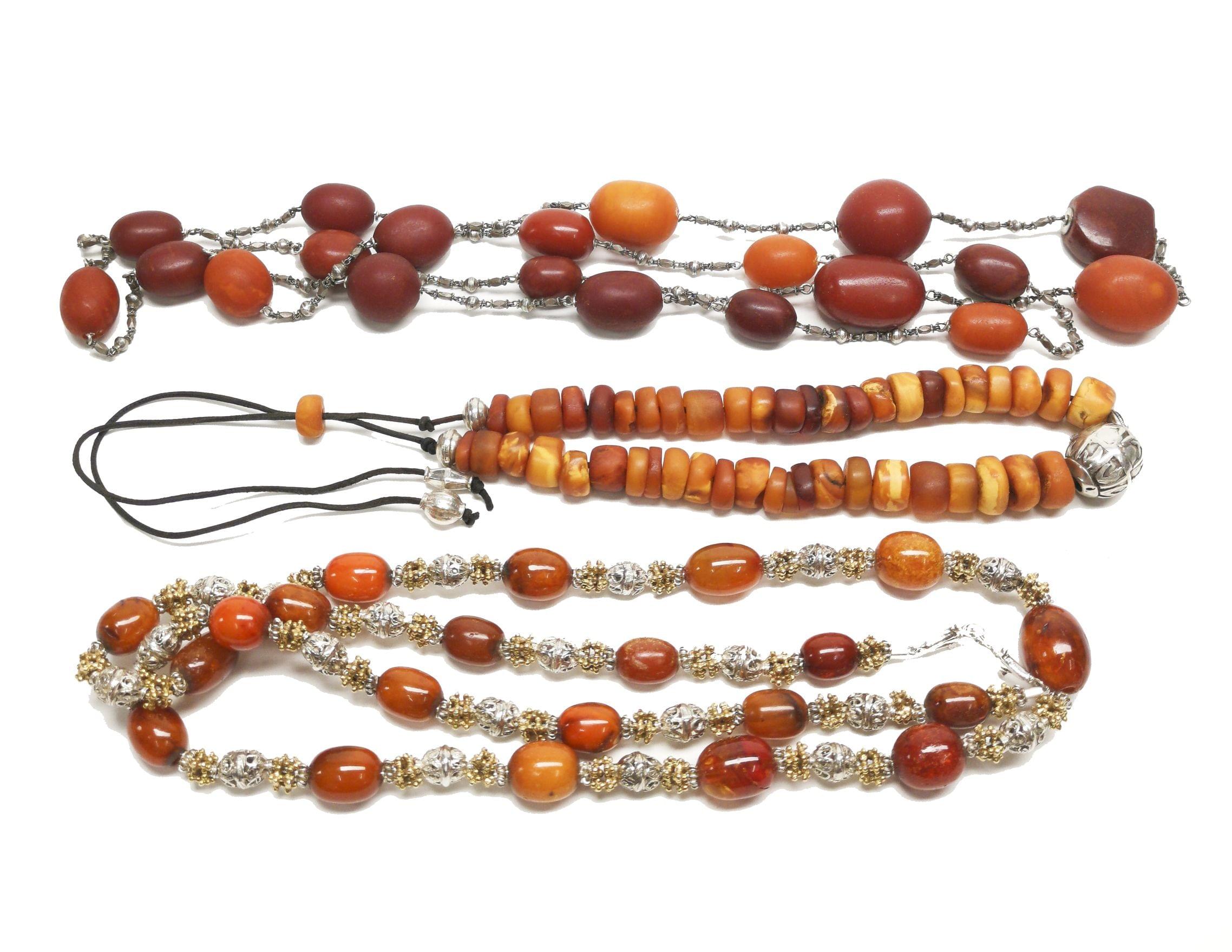 3275. Lot de deux sautoirs et d'un collier composés de perles d'ambre