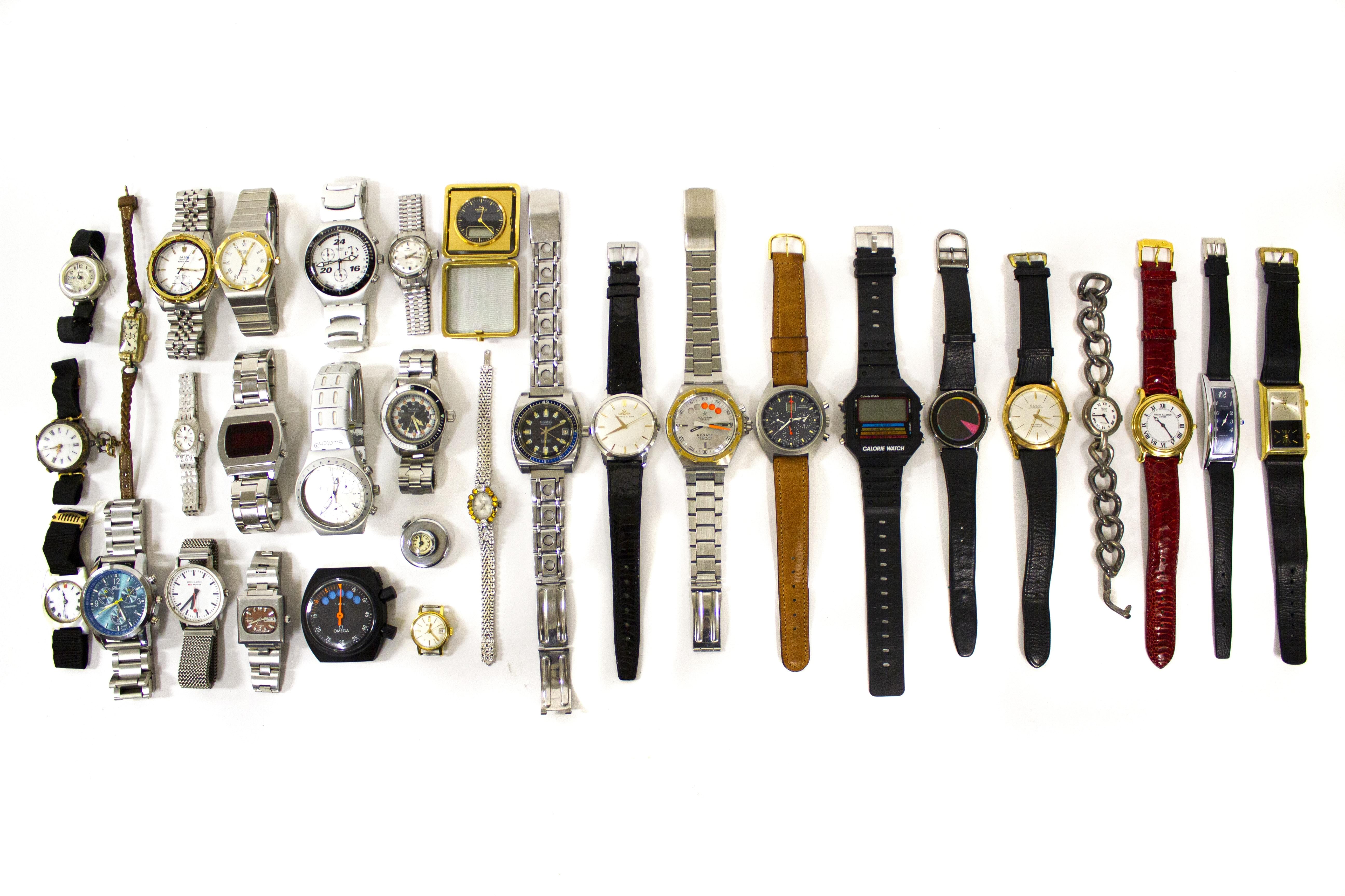 3067. Lot de différentes montres comprenant notamment les marques suivantes: Swatch, Movis, Pierre Balmain, Alba, Shshd, Seiko, Mondaine, Monvie, Sargent, Lemania, Guda, Astorex, Clinton, Aquastar, Pryngeps, Chromacron, Eton, Horus, Memo et Nepro