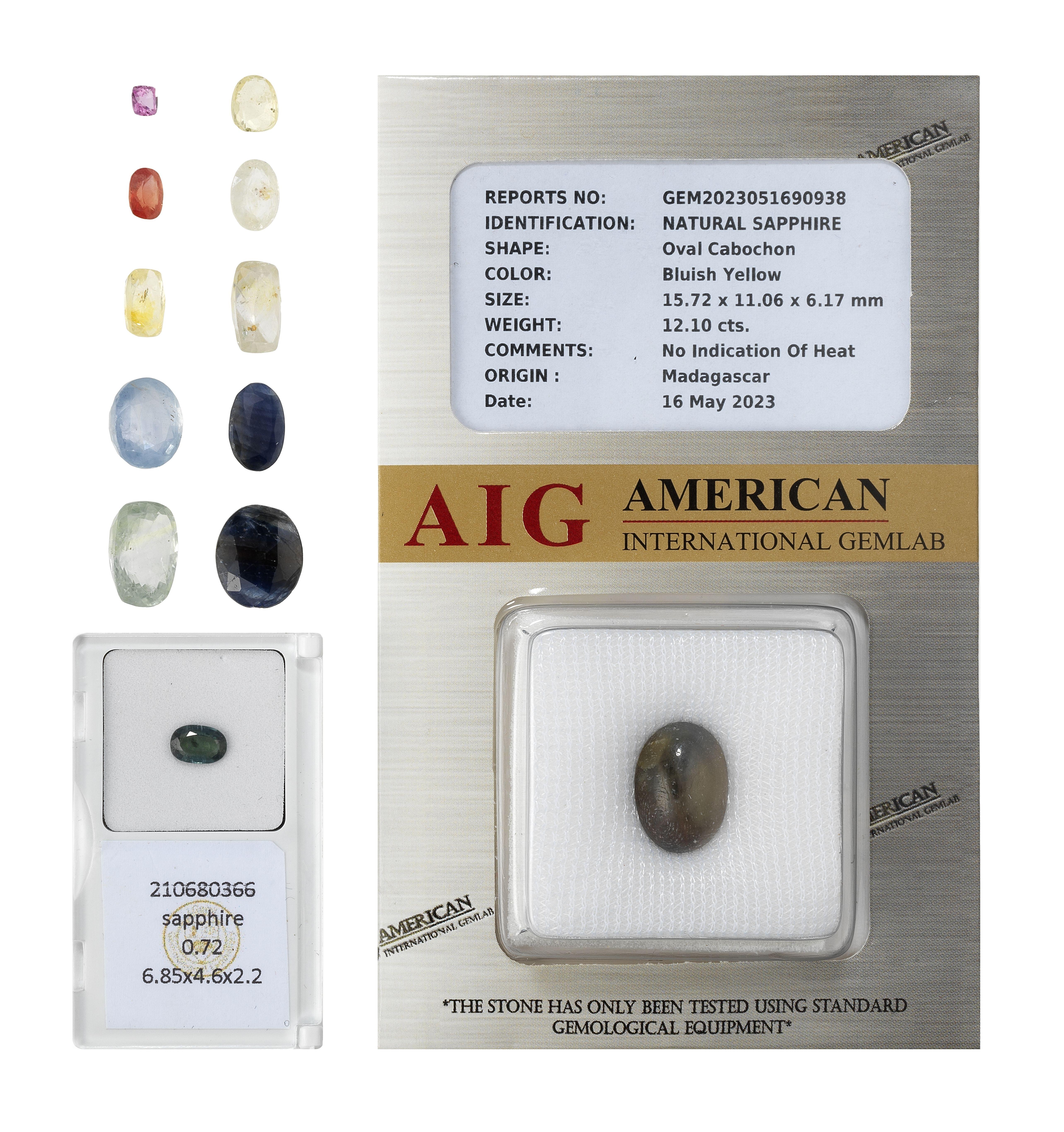 Un saphir taille cabochon ovale (12,10 ct), trois saphirs bleus taille ovale (3,32, 4,94 et 6,52 ct), trois saphirs jaunes taille coussin et ovale (1,38, 1,90 et 4,23 ct), un saphir rose taille coussin (0,27 ct), un saphir incolore taille ovale (2,12 ct), deux saphirs verts taille ovale et coussin (0,72 et 7,01 ct), accompagnés de certificats AIG et GFCO. On joint un saphir orange taille ovale chauffé (0,97 ct). Pour les lots précédés d'un *, la TVA de 7,7% est due sur l'entier du prix d'adjudication.