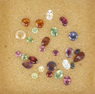 Lot de diverses pierres semi-précieuses sur papier, dont trois améthystes (1,45 ct), cinq grenats (2,67 ct) et deux topazes blanches (1,05 ct)