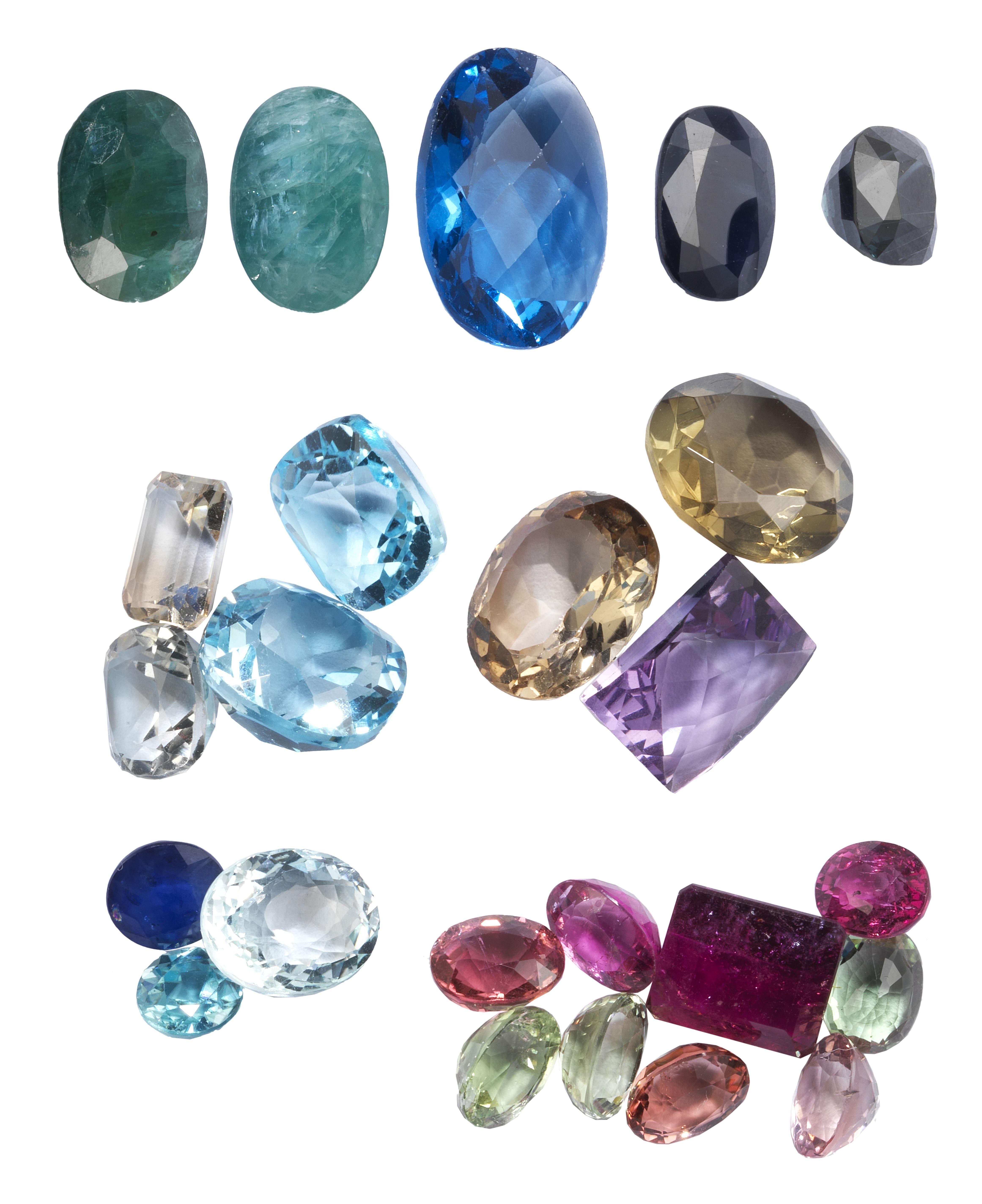 Un saphir taille ovale (3,56 ct), un saphir taille brillant (env. 1,3 ct), un spinelle bleu taille coussin (2,67 ct), une fluorite colore-change (9,17 ct), une aigue-marine taille ovale (env. 2,8 ct), un lot de tourmalines roses et vertes (total env. 11,7 ct), une améthyste taille fantaisie (env. 4,9 ct), deux citrines (total env. 9,6 ct) et un lot de topazes (total env. 17,9 ct), certaines accompagnées de certificats ALGT et IGE
