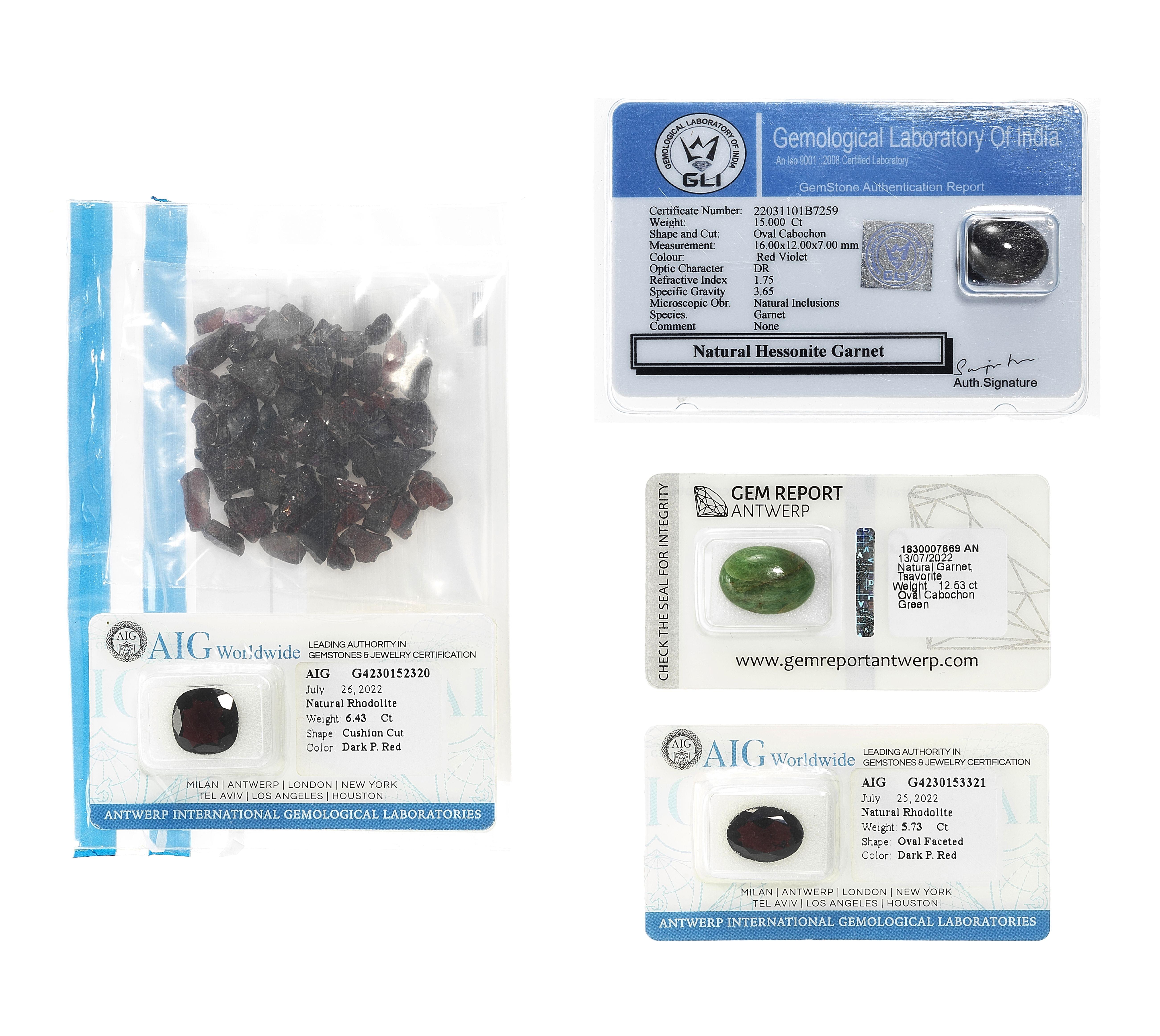 Deux aigues-marines taille ovale sur papier (81,15 et 17,55 ct), deux rhodolites taille ovale et coussin (5,73 et 6,43 ct), une hessonite taille cabochon ovale (15,0 ct), une tsavorite taille cabochon ovale (12,53 ct), un lot de grenats bruts (total 119,1 ct), une opale à fond noir taille cabochon poire (11,54 ct), un saphir rose et une tourmaline rose sculptés chacun à motif de feuille (0,53 et 5,33 ct) et un lot de tourmalines de diverses couleurs taille cabochon (total 10,34 ct), accompagnées de certificats ITLGR, IGL&I et AIG. Pour les lots précédés d'un *, la TVA de 7,7% est due sur l'entier du prix d'adjudication.