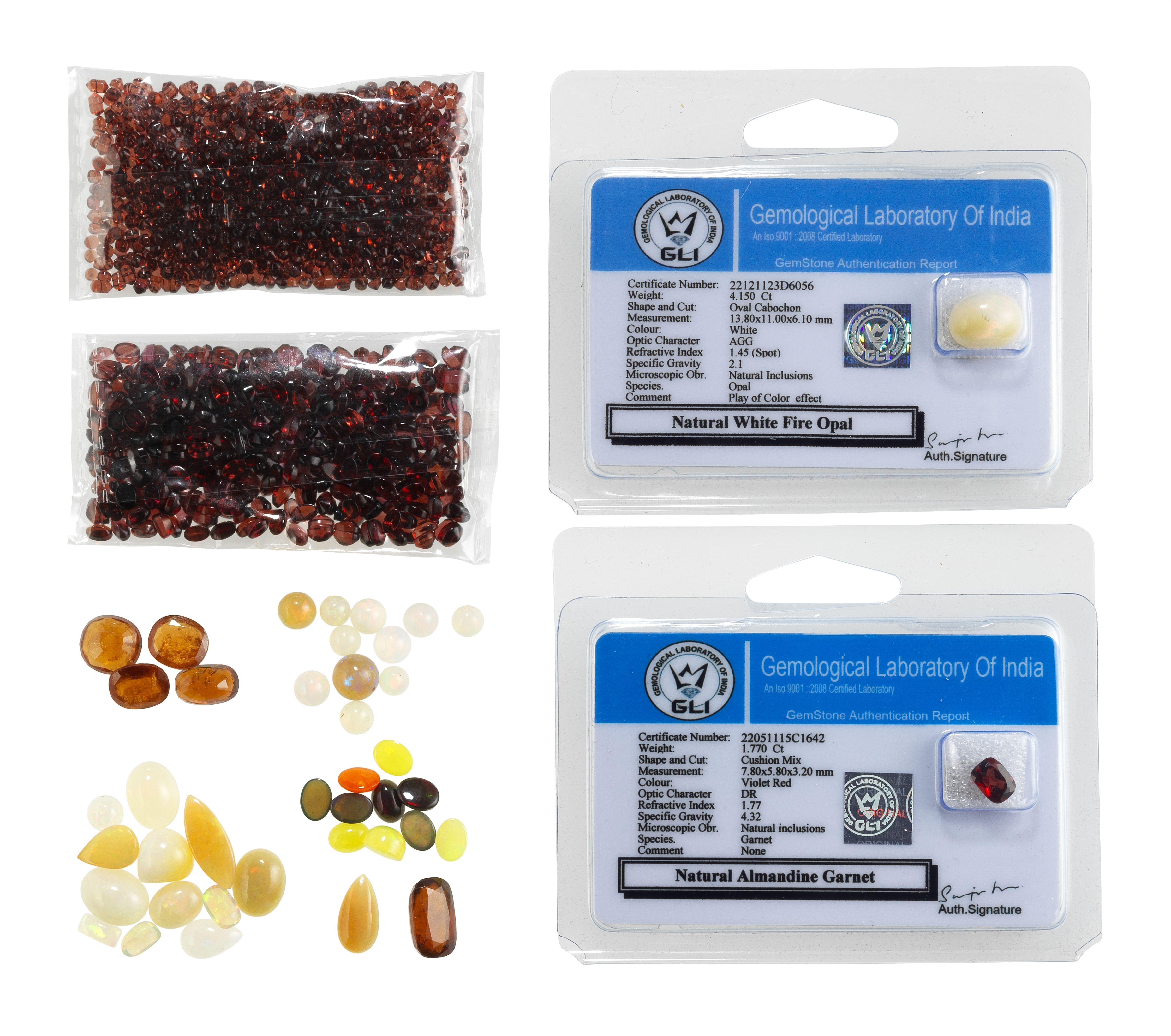 Un lot d'opales taille cabochon (env. 25 ct), un lot de billes d'opales (env. 15,5 ct), une opale taille cabochon poire (1,72 ct), un lot d'opales taille cabochon ovale (8,7 ct), une opale taille cabochon ovale (4,15 ct), une hessonite taille ovale (9,99 ct), un grenat almandin taille ovale (1,77 ct), et trois lots d'hessonites (21,2, 160 et 180 ct), certains accompagnés de certificats IGL&I et GLI. Pour les lots précédés d'un *, la TVA de 7,7% est due sur l'entier du prix d'adjudication.