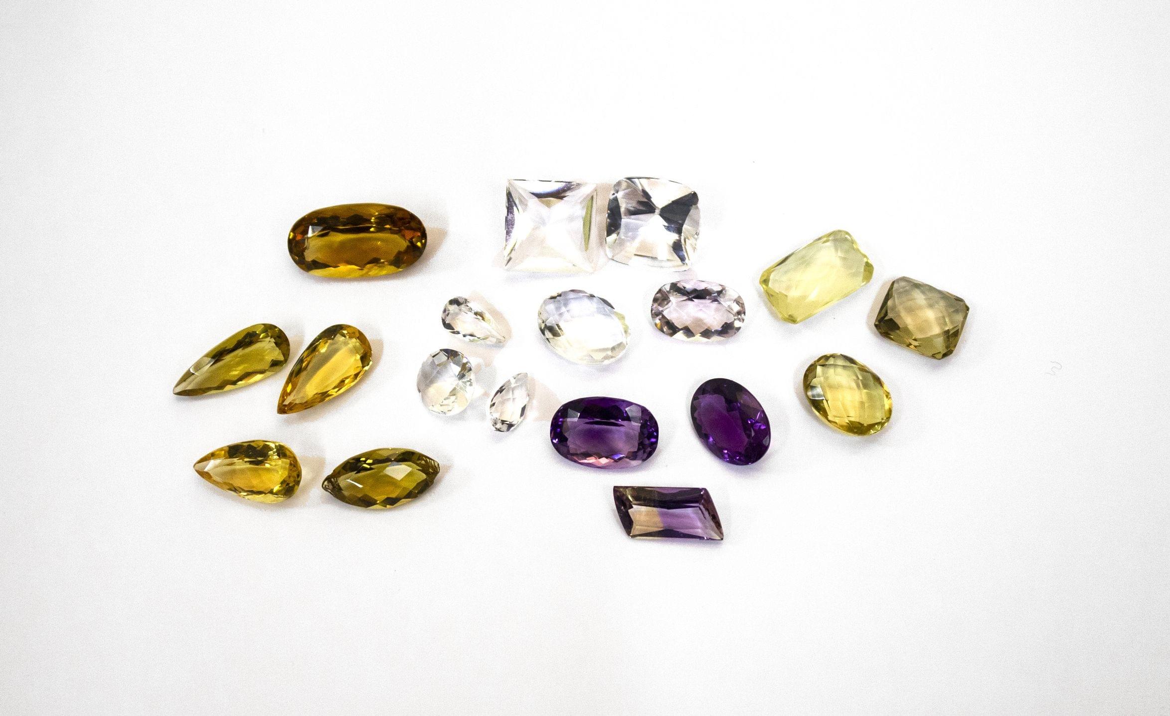 ot de pierres facettées comprenant sept cristal de roche (total env. 52,3 ct), deux améthystes (total env. 18,6 ct), une amétrine (env. 5,7 ct), trois prasiolites (total env. 31,6 ct) et cinq citrines (total env. 47 ct)