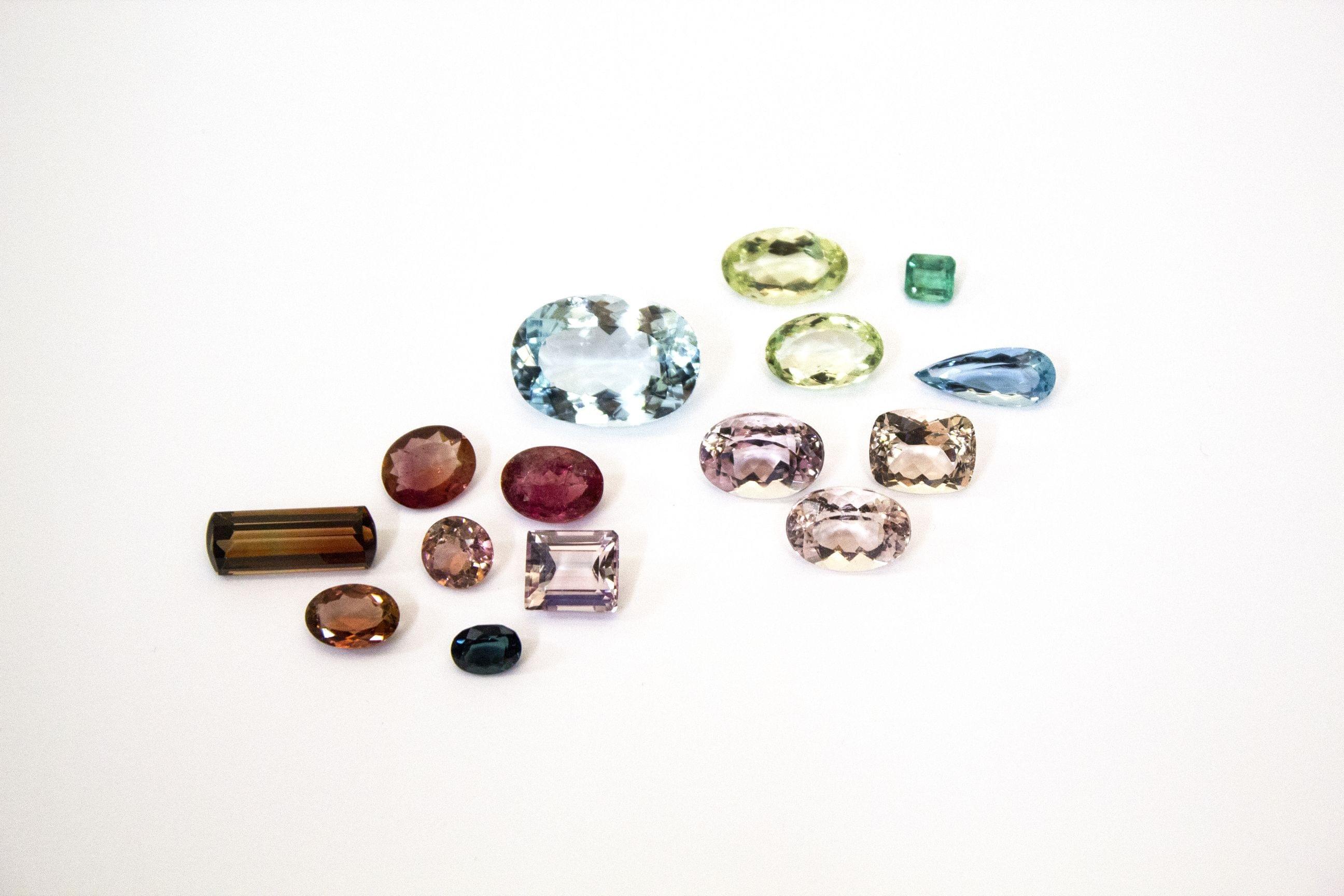 ot de pierres facettées comprenant une émeraude (env. 0,8 ct), une aigue-marine (env. 3 ct), une topaze bleue (env. 24,5 ct), deux béryls verts (total env. 8,9 ct), trois morganites (total env. 19,4 ct), sept tourmalines (total env. 25,3 ct)