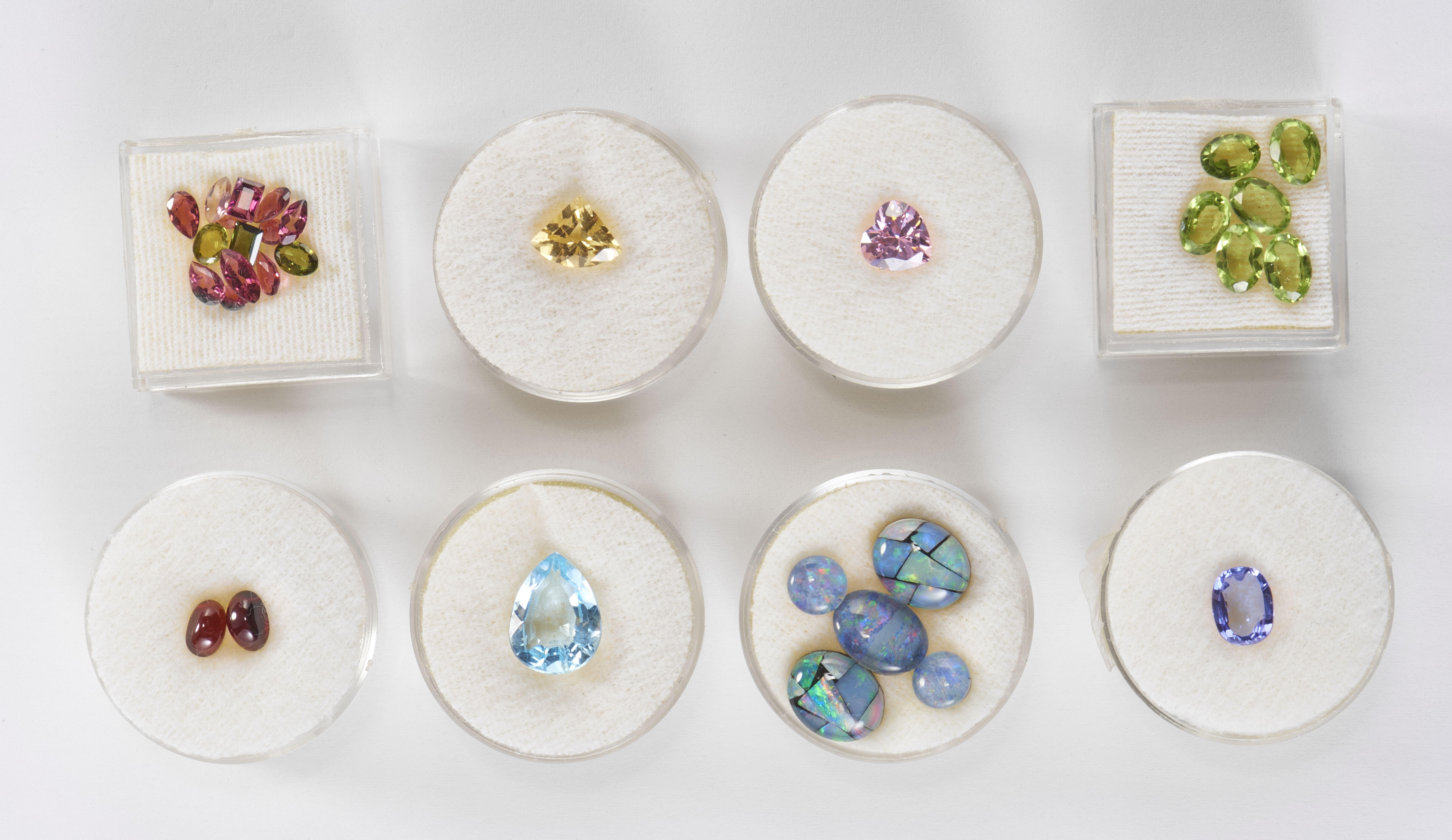 Une tanzanite taille ovale (1,1 ct), une topaze bleue taille poire (4,4 ct), une citrine taille fantaisie (1,1 ct), deux grenats taille cabochon (1,4 ct), un ensemble de petites tourmalines roses et vertes (2,3 ct) et six péridots taille ovale (4,3 ct). On joint un lot de doublet d'opales et un cœur en oxyde de zirconium rose.