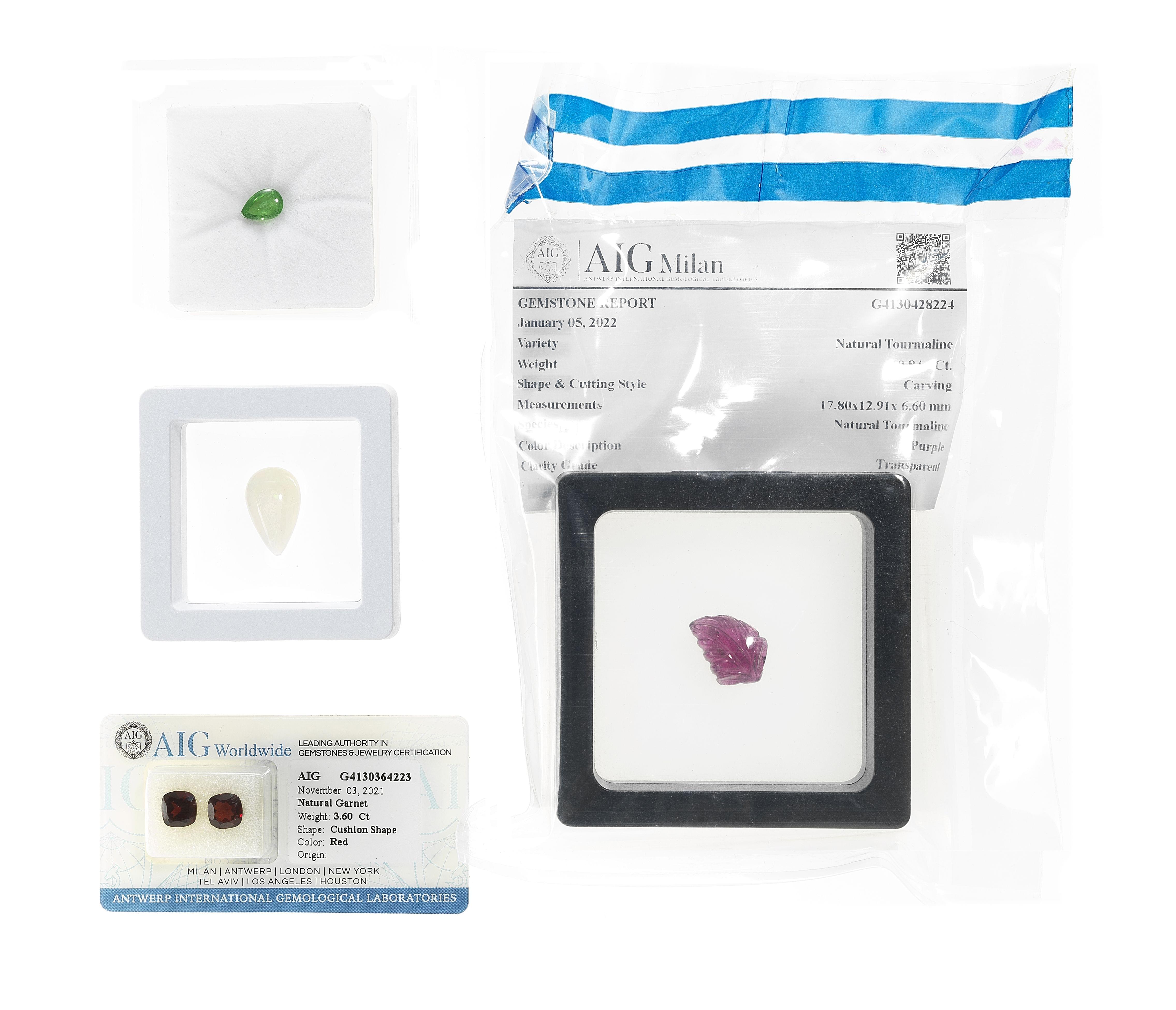 Deux grenats taille coussin (total 3,6 ct), une tsavorite taille cabochon poire (1,88 ct), une tourmaline sculptée à motif de feuille (10,84 ct) et une opale à fond blanc taille cabochon poire (5,8 ct), accompagnés de certificats AIG et LGemL. Pour les lots précédés d'un *, la TVA de 7,7% est due sur l'entier du prix d'adjudication.