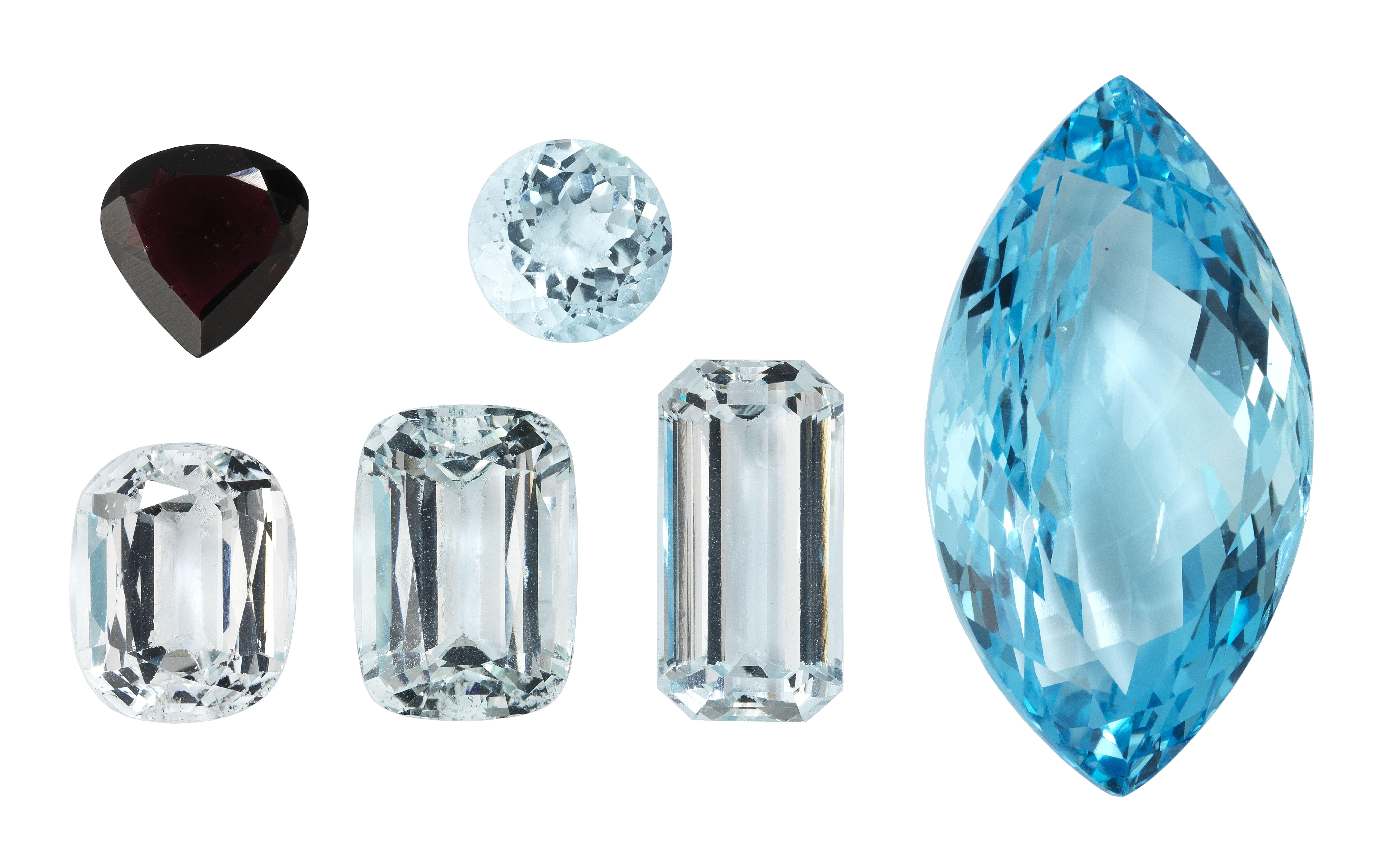 Une goshénite taille coussin ovale (14,71 ct), une rhodolite taille poire (5,42 ct), une goshénite/aigue-marine taille émeraude (17,57 ct), une topaze bleue taille brillant (7,88 ct), une topaze bleue taille marquise (124,55 ct) et une aigue-marine taille coussin ovale (17,58 ct), accompagnées de certificats GFCO et AIG. Pour les lots précédés d'un *, la TVA de 7,7% est due sur l'entier du prix d'adjudication.