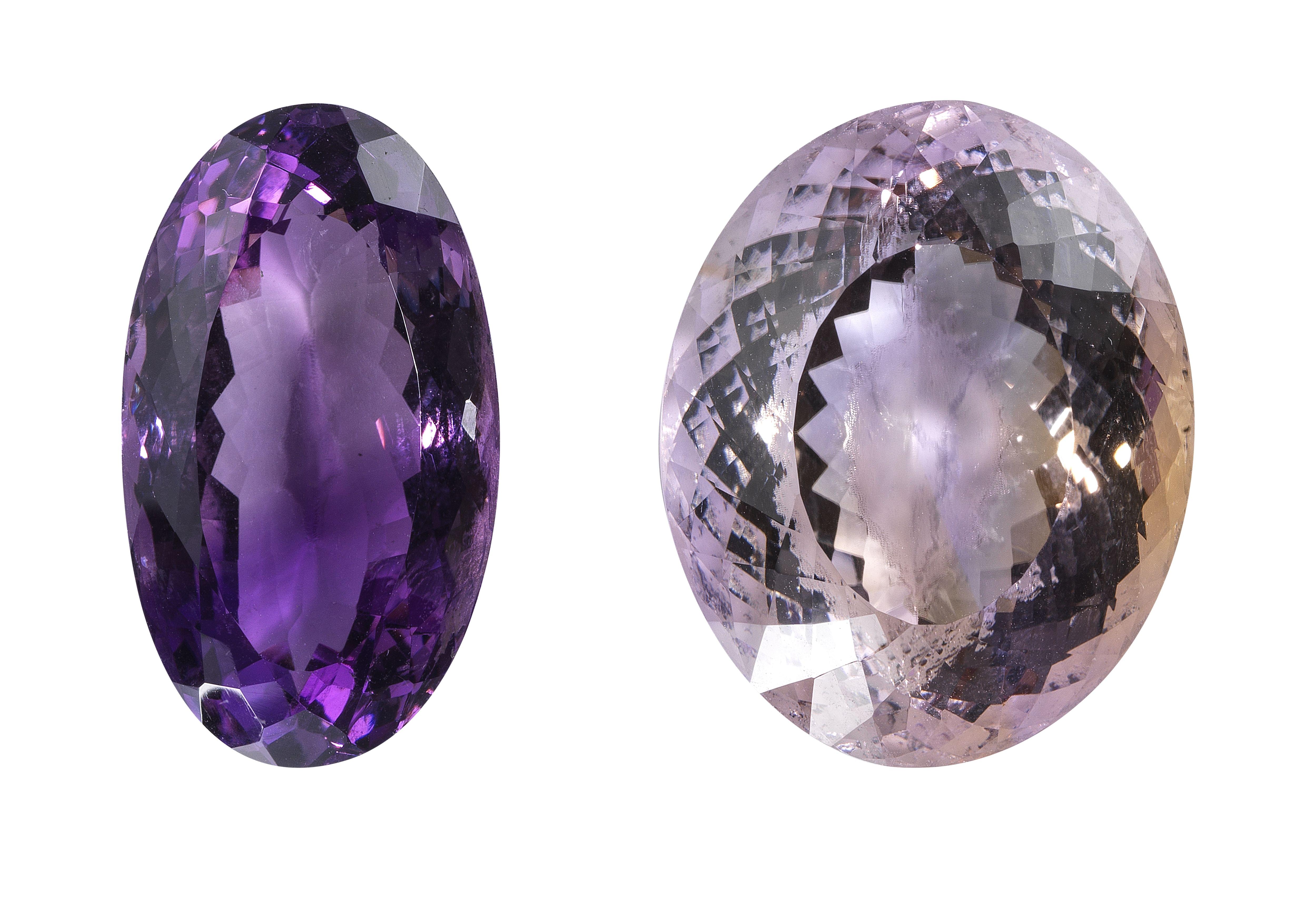 Une améthyste taille ovale (45,30 ct) et une amétrine taille ovale (86,73 ct). Pour les lots précédés d'un *, la TVA de 7,7% est due sur l'entier du prix d'adjudication.