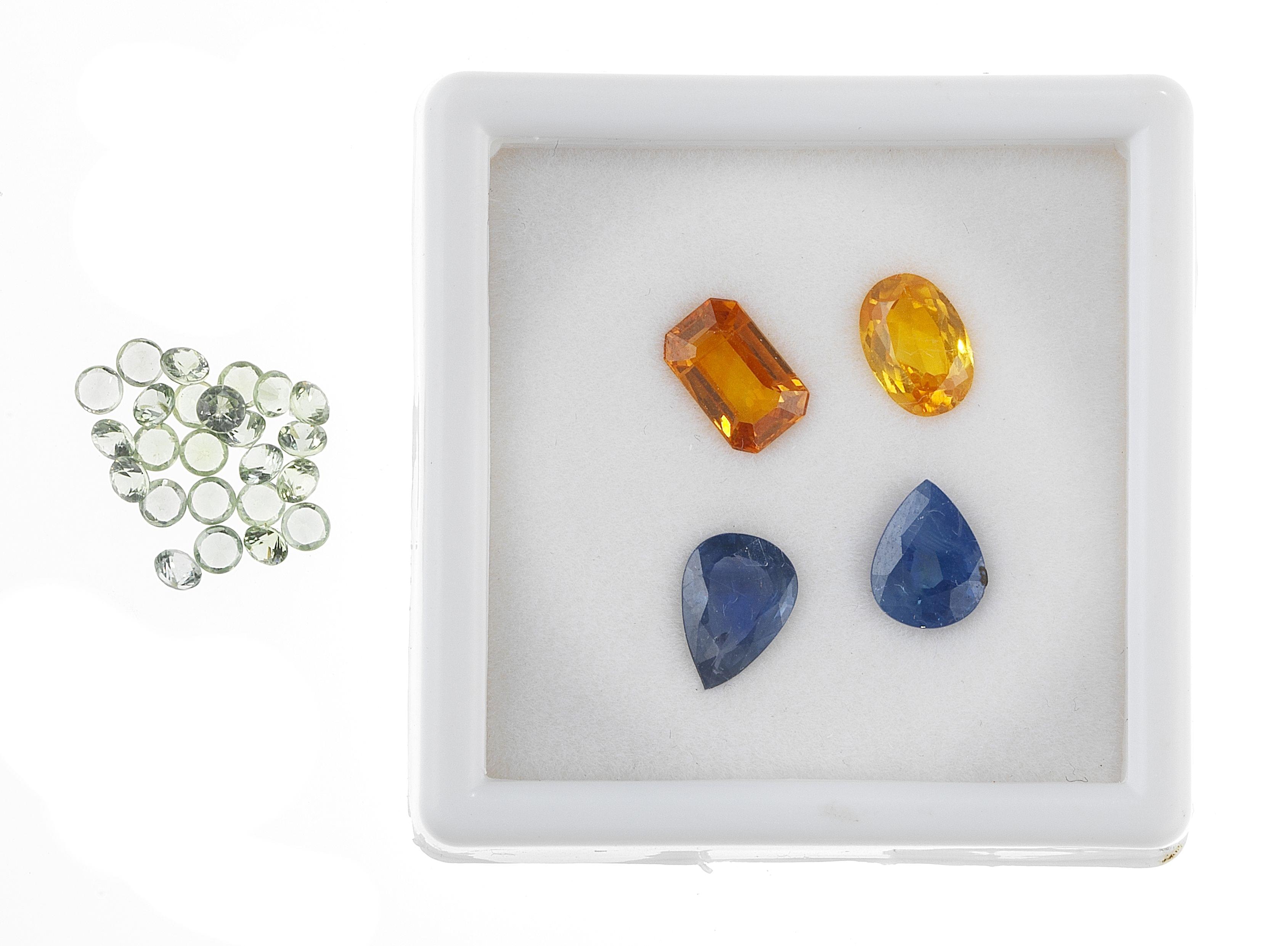Deux saphirs taille poire (env. 1,08 et 1,59 ct), un saphir jaune taille ovale (env. 1,28 ct) et un saphir orange taille émeraude (env. 1,41 ct). On joint un lot de petits saphirs verts de pavage (2,31 ct), accompagnés d'un certificat GFCO. Pour les lots précédés d'un *, la TVA de 7,7% est due sur l'entier du prix d'adjudication.