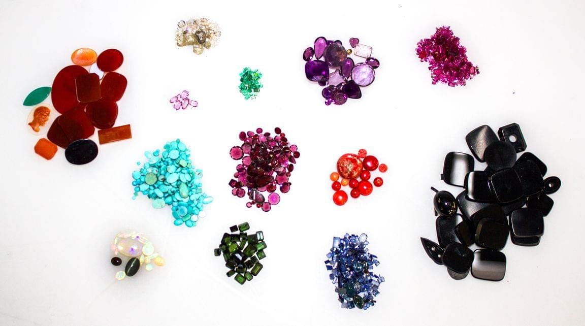 Lot de pierres sur papier comprenant notamment: env. 10 ct de diamants bruts, env. 34 ct de saphirs, env 23 ct de saphirs roses, env. 5 g de turquoises, env. 1.5 ct de tourmaline rose, env 3 ct d'émeraudes, env. 36 ct de grenats almandins, env 50 ct d'améthystes, env 15 ct de tourmaline verte, env. 2.7 ct d'opales, env. 1.5 ct d'œil de chat