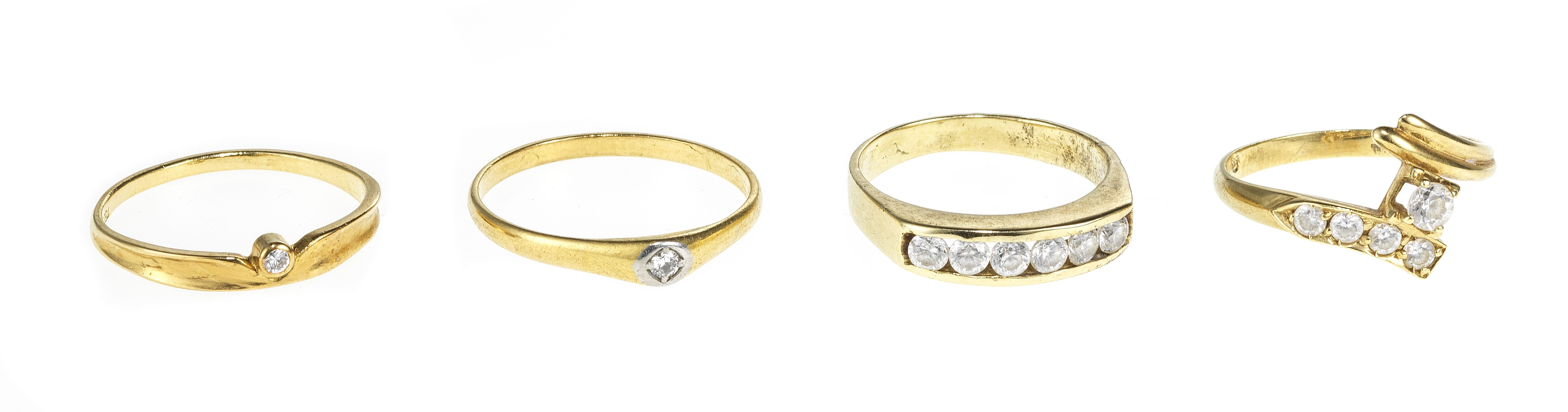 Deux d'entre elles serties de diamants et les deux autres serties de pierres d'imitation pour le diamants, or 750 et or 585, doigt 52-12, 53-13, 54-14 et 57-17, 8 g