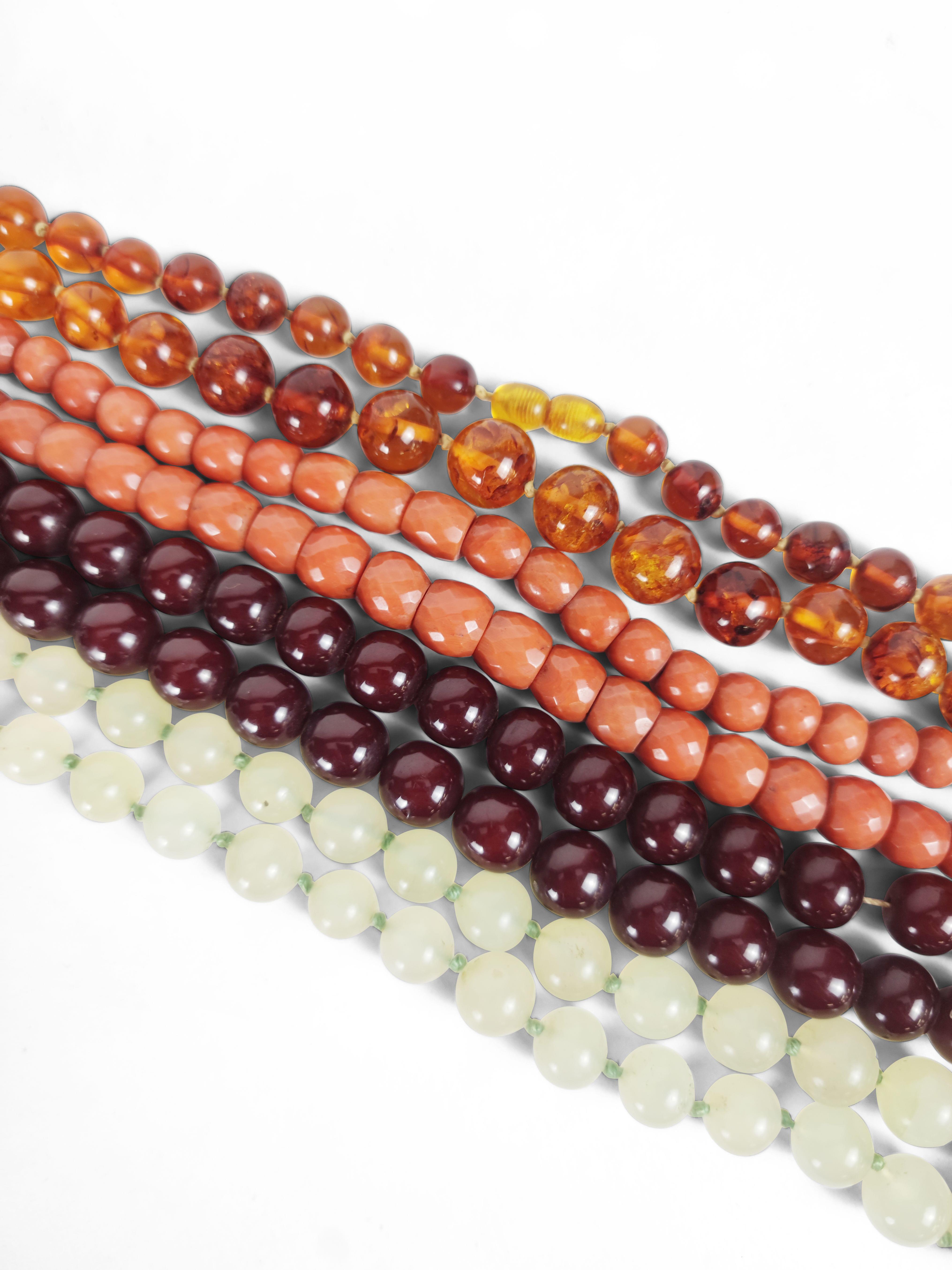 L'un composé de deux rangs de perles de corail facettées terminé par un fermoir Napoléon III, deux composés de perles d'ambre, l'une de perles de jadéite en chute et le dernier à motif de croix en argent et pierre dure, métal, argent 925 et or 750, L entre 53 et 80 cm, H 6 cm