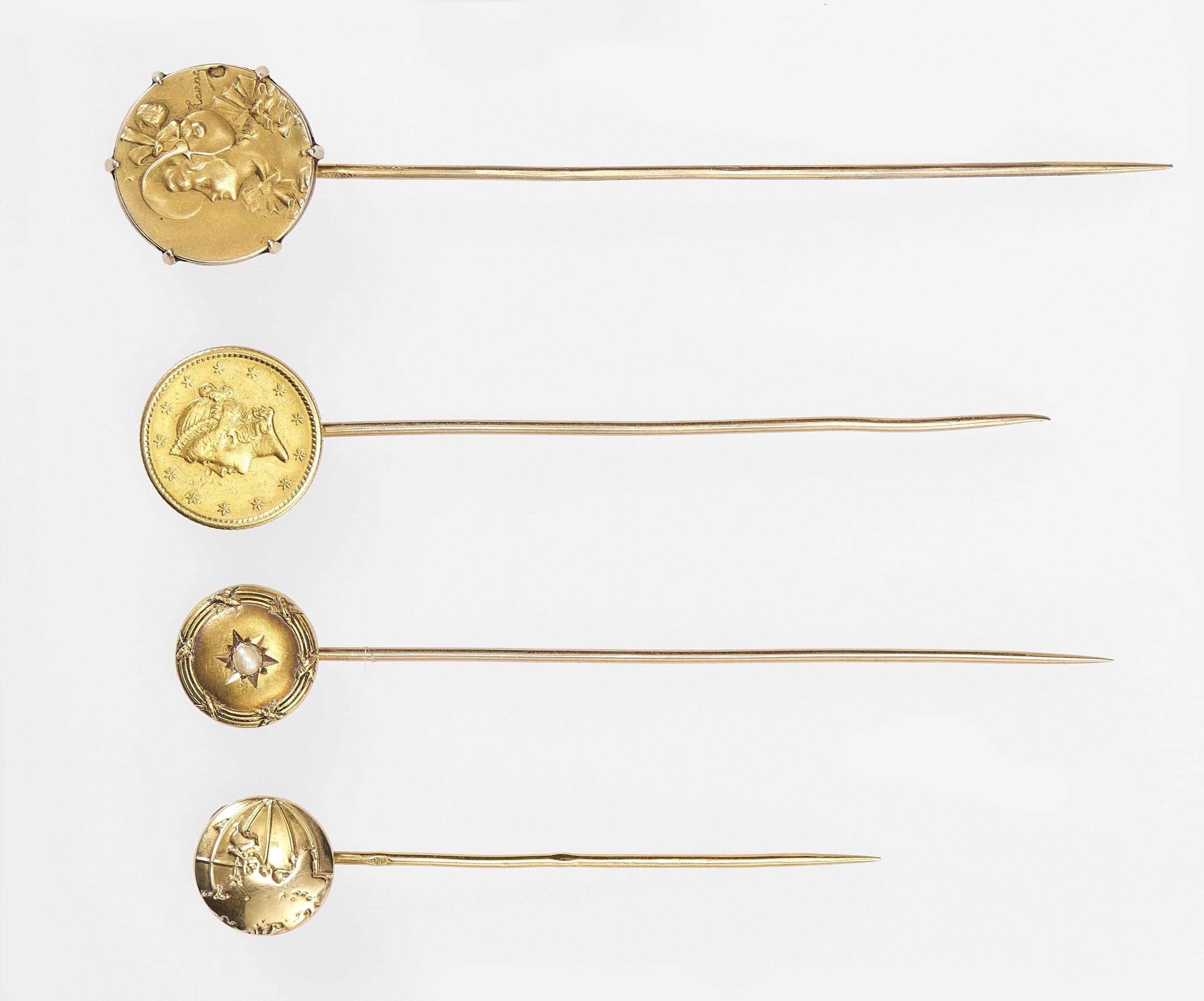 L'une à médaillon Art nouveau signé Toirac, l'une sertie d'une pièce américaine, l'une sertie d'un planisphère et la dernière centrée d'une demi-perle, or 750, L entre 5 et 7,5 cm, 7 g. Provenance: collection Pernet-Villaverde