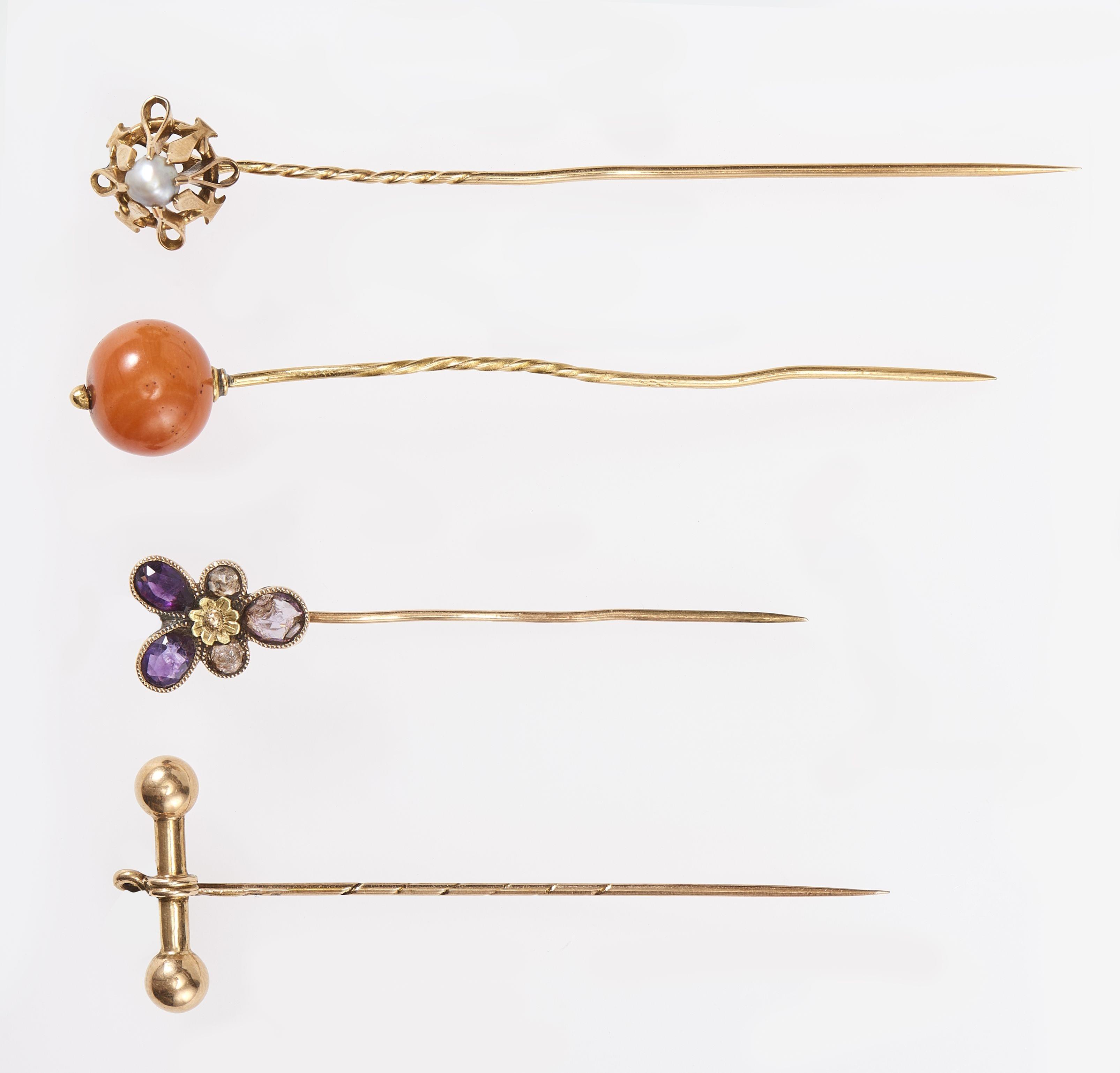 L'une retenant une demi-perle, l'une sertie d'une boule de corail, l'une sertie d'un motif d'améthystes et la dernière à motif stylisé