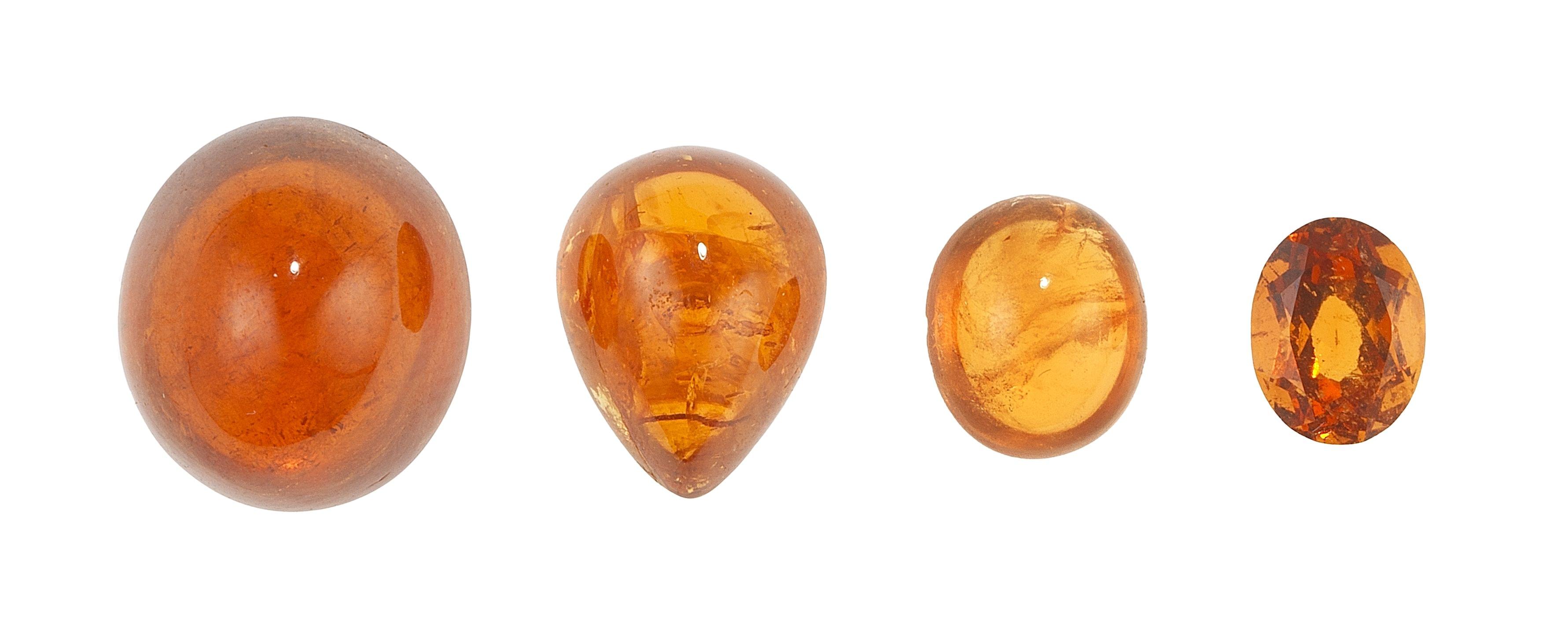 L'un taille ovale (env. 1,74 ct), l'un taille cabochon poire (env. 7,03 ct) et les deux derniers taille cabochon ovale (env. 3,38 et 15,11 ct), accompagnés d'un certificat GFCO. Pour les lots précédés d'un *, la TVA de 7,7% est due sur l'entier du prix d'adjudication.