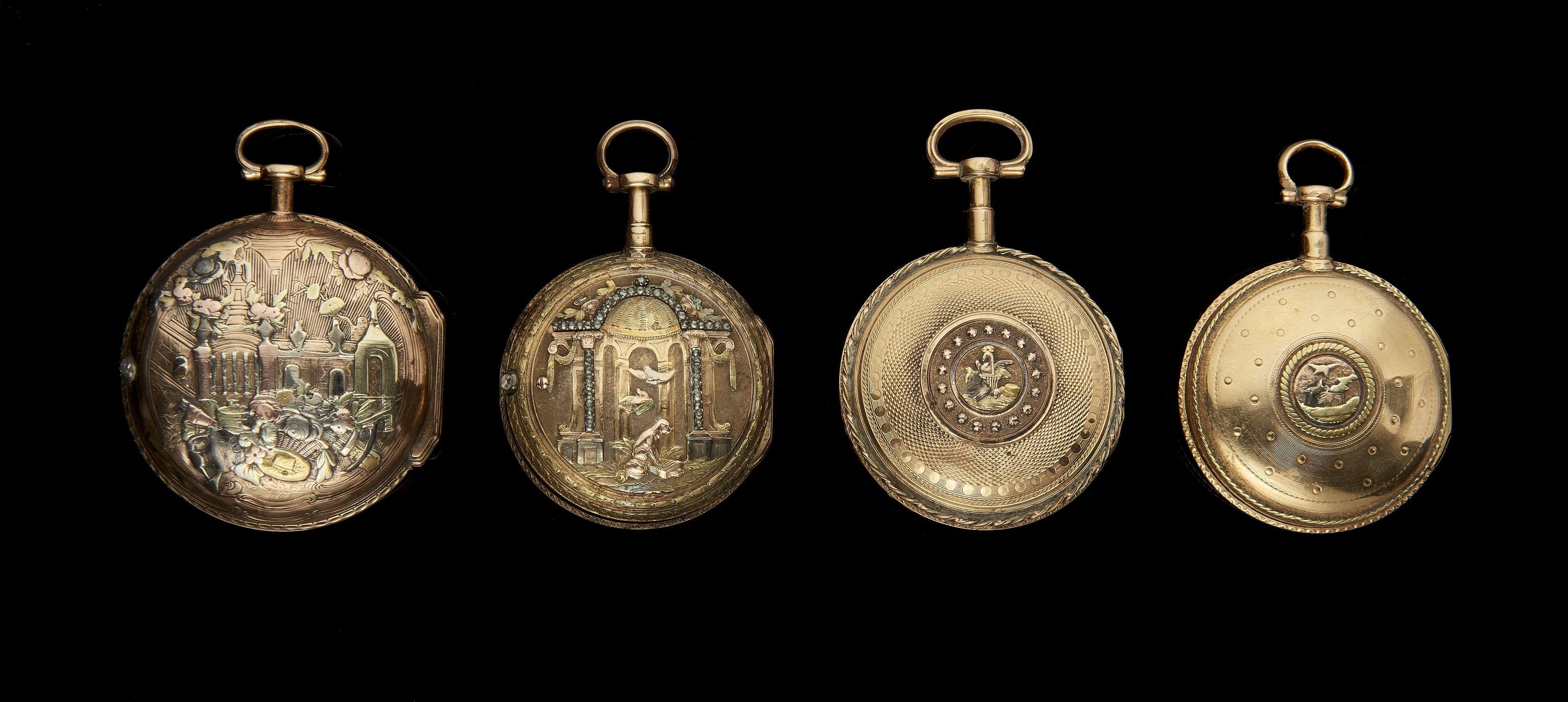 73. Lot de quatre montres de poche, une signée Guenault à Châlons à décor d'architecture et une deuxième signée Hüe à Rouen