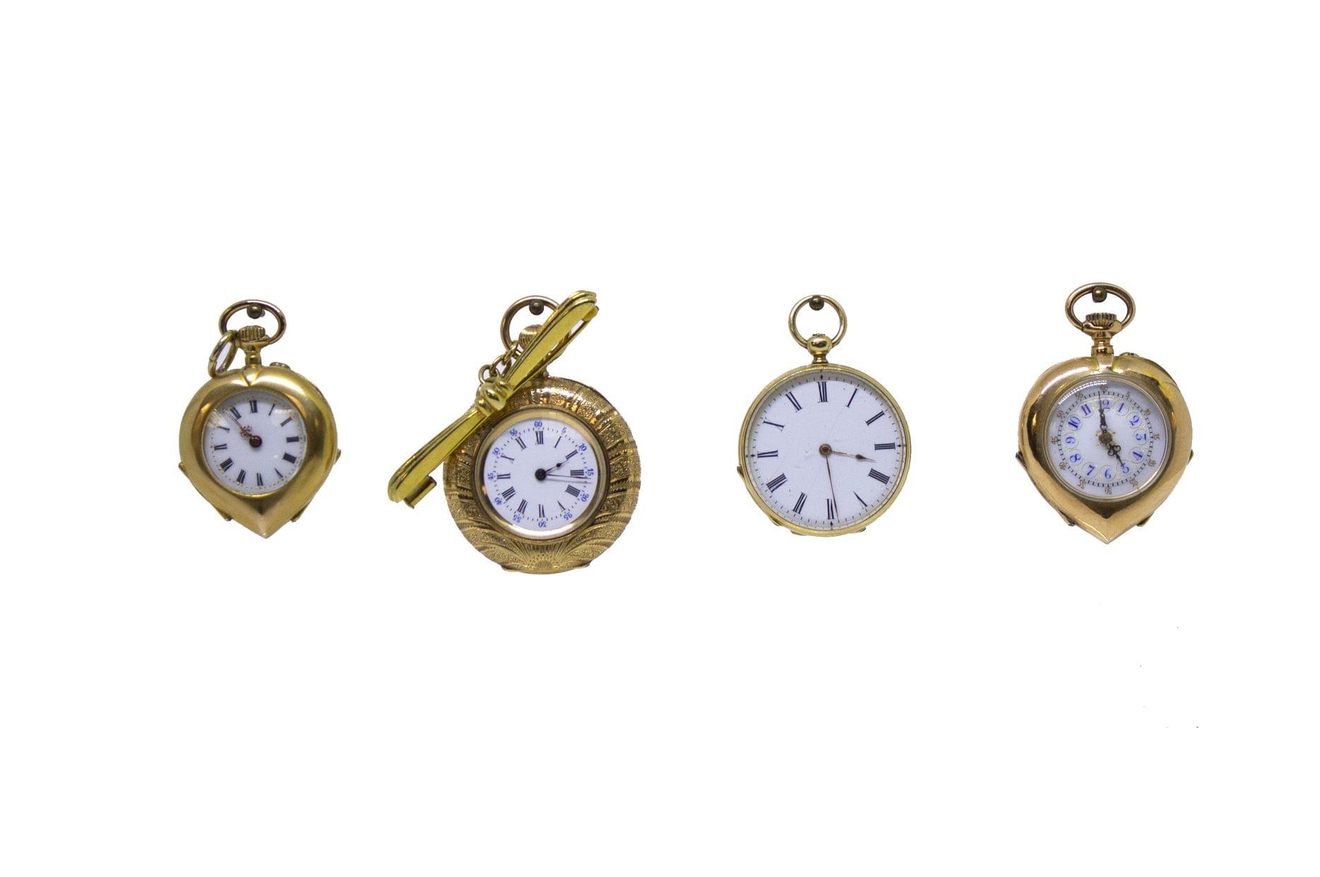 3148. Lot de quatre petites montres de poche, deux de forme cœur à décor d'oiseaux et cerises, une guilochée et une à décor gravé de rinceaux