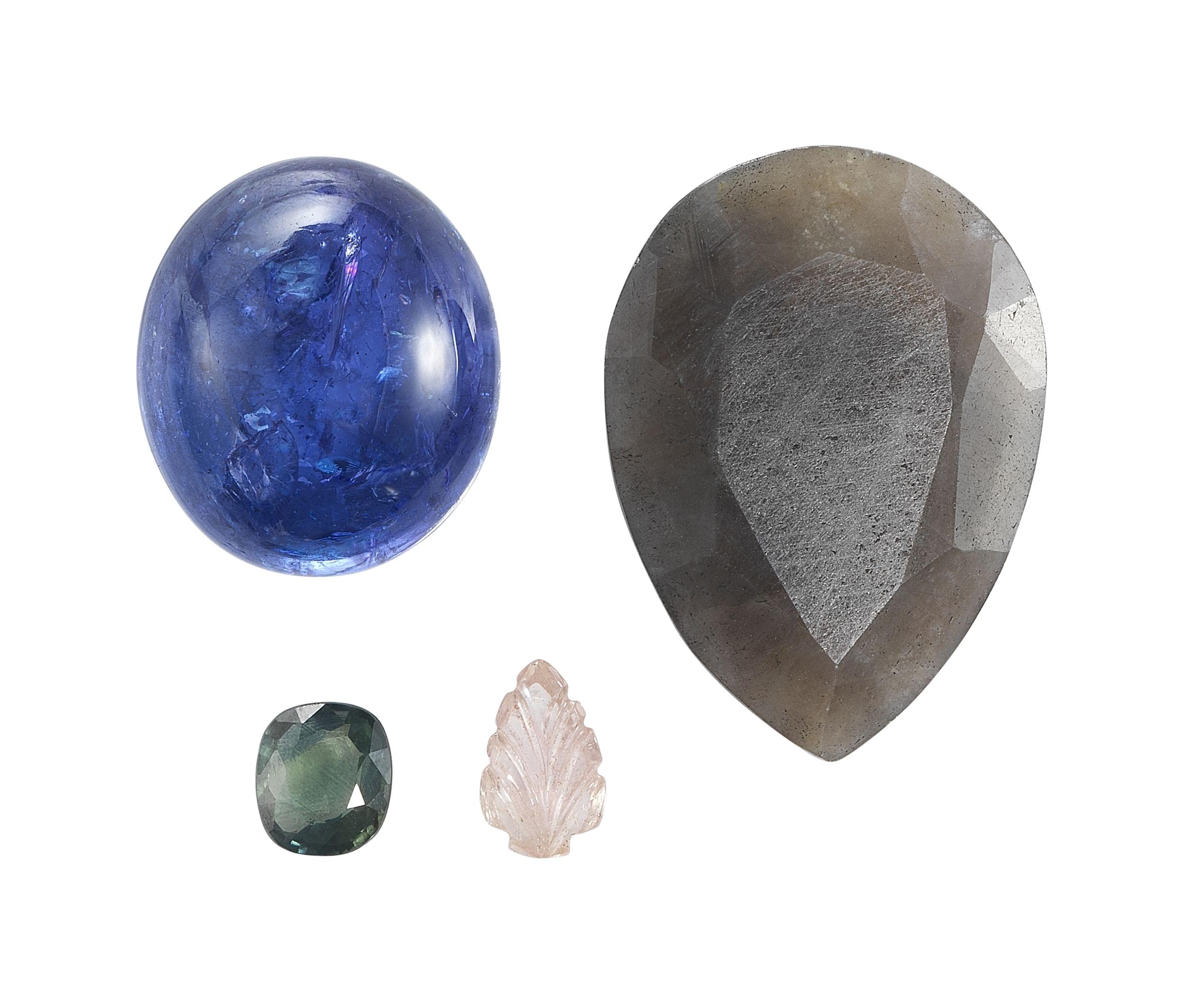 Une tanzanite taille cabochon ovale (15,68 ct), un saphir non traité taille poire (19,9 ct), un saphir taille coussin (0,68 ct) et un saphir rose sculpté (0,70 ct), accompagnées de certificats IDT, IGL&I et ITLGR. Pour les lots précédés d'un *, la TVA de 7,7% est due sur l'entier du prix d'adjudication.