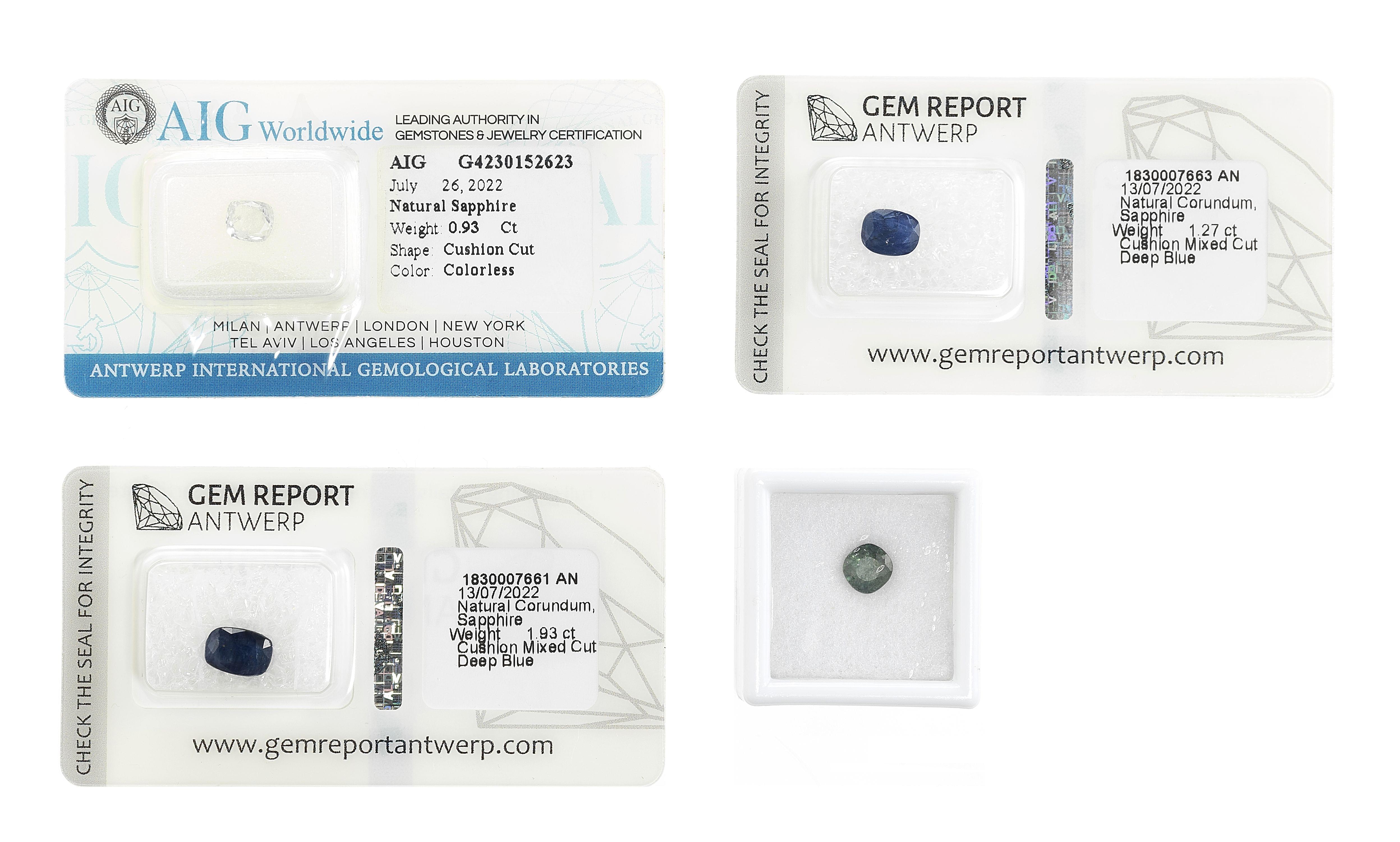 Deux saphirs taille coussin ovale (1,27 et 1,93 ct), l'un non chauffé, un saphir vert taille coussin (0,95 ct) et un leucosaphir non chauffé taille coussin ovale (0,93 ct), accompagnés de certificats Gem Report Antwerp, ITLGR et AIG. Pour les lots précédés d'un *, la TVA de 7,7% est due sur l'entier du prix d'adjudication.