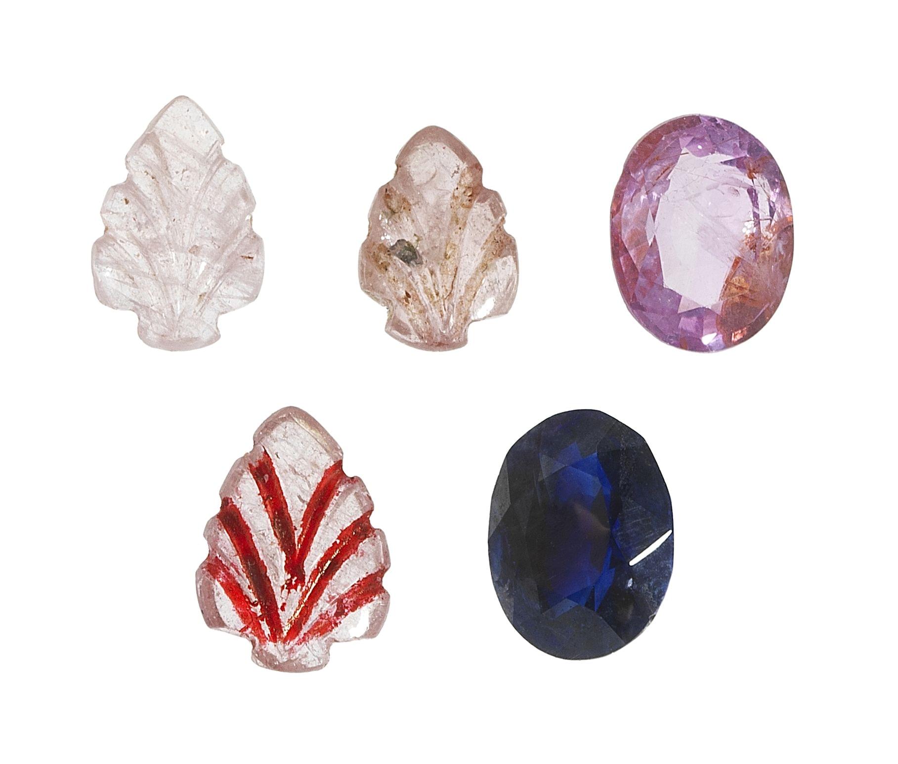 Un saphir bleu taille ovale (1,2 ct), un saphir rose taille ovale (0,78 ct) et trois petits saphirs roses sculptés à motifs de feuilles (total 1,45 ct), accompagnés de certificats LGemL. Pour les lots précédés d'un *, la TVA de 7,7% est due sur l'entier du prix d'adjudication.