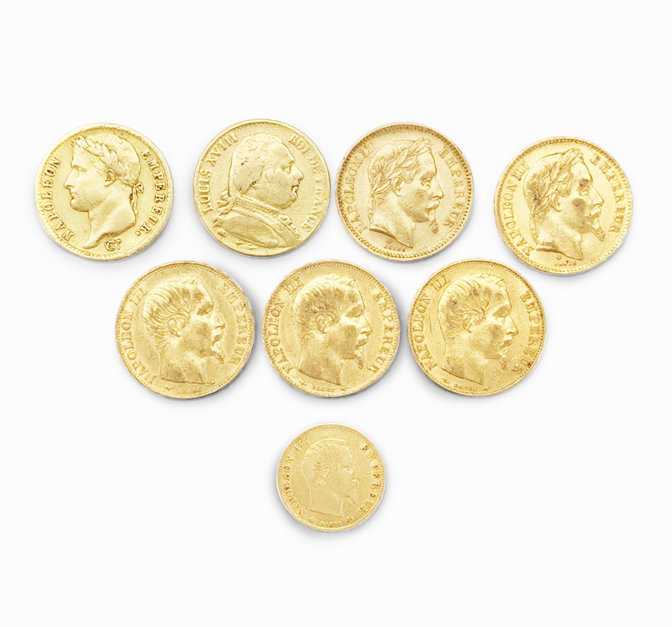 Une pièce époque Empire datée de 1810, une pièce époque Restauration datée de 1814, cinq pièces Second Empire datées de 1854, 1858, 1863 et 1867 et d'une pièce de 5 francs Second Empire datée de 1860, or 900, 46 g