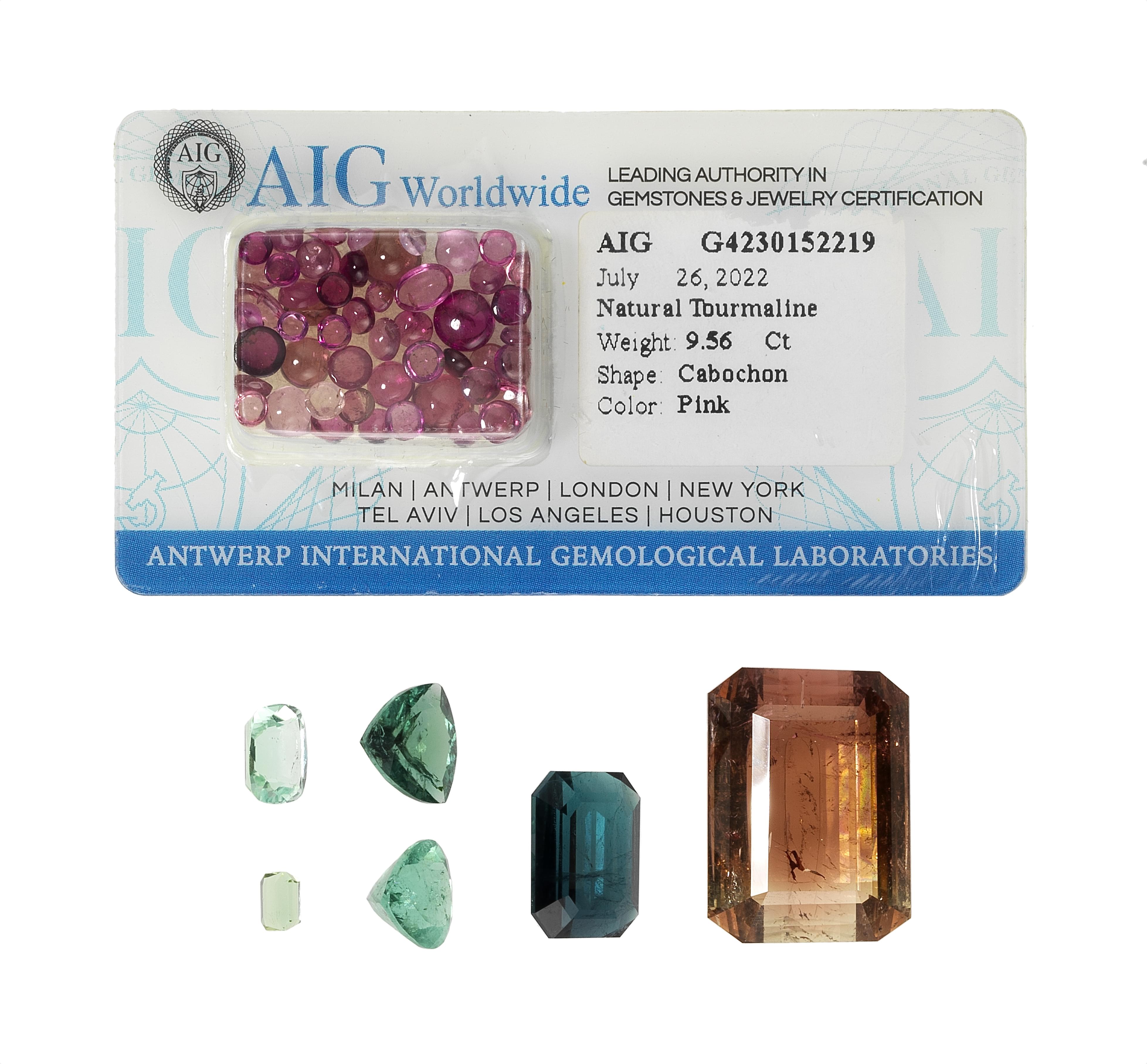 Une tourmaline bicolore rose et orange taille rectangle (46,37 ct), une indigolite octogonale (8,16 ct), une tourmaline taille coussin poire bleu-vert (2,90 ct), une tourmaline triangulaire bleu-vert (3 ct), une tourmaline bleu-vert taille coussin (1,67 ct), une tourmaline jaune-verte taille rectangle (0,54 ct) et un lot de tourmalines rose taille cabochon (total 9,56 ct), accompagnées de certificats GFCO, AIG et GIL. Pour les lots précédés d'un *, la TVA de 7,7% est due sur l'entier du prix d'adjudication.